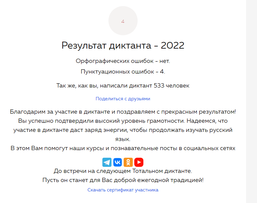 Напомню, по моим данным я насчитала у себя 13 пунктуационных ошибки и ноль орфографических. Признаюсь, я рассчитывала, что, как минимум, половину ошибочных знаков препинания засчитают в мою пользу, поскольку эти моменты были спорные.