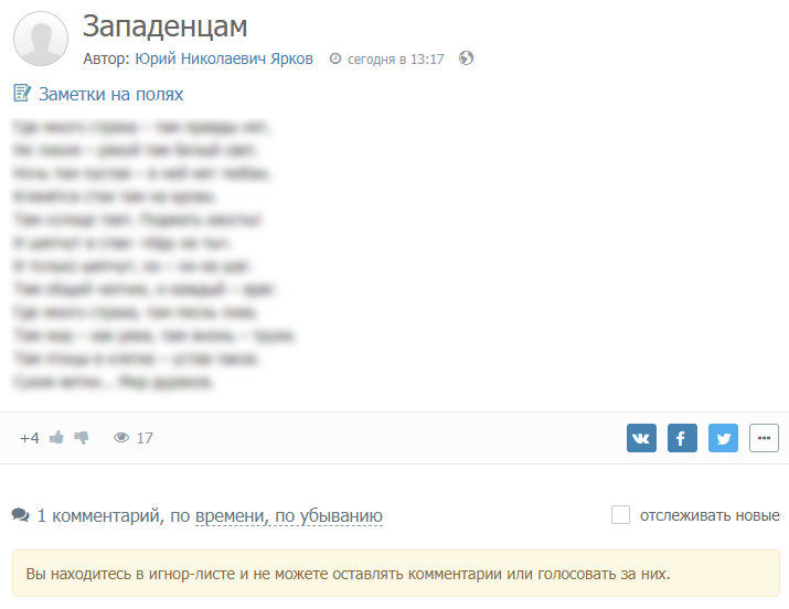 Автор: Вита АлаяВот и я схлопотала первый игнор! Непонятно за что. Единственное подозрение - невольное оскорбление чувств верующих культурологическими выкладками на фоне грядущих праздников в комментах. Причём игнор совсем не от того лица, которое я оскорбила, которому принесла извинения и получила прощение, благо не все так скоры на расправу.