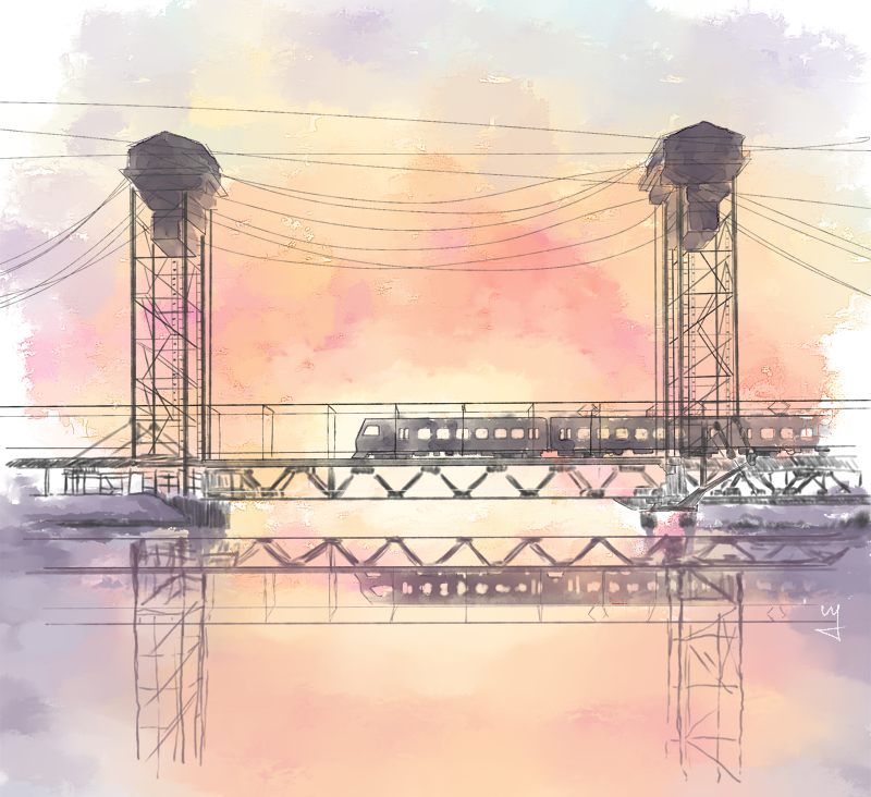 Двухъярусный мост. Построен он был немцами еще до Второй Мировой. Сейчас он поднимается противовесами, а изначально открывался, как калитка. Произведение клепаного инженерного искусства. Наши городские власти лоббируют его снос, прикрываясь ветхостью моста (структура, в чьем ведении он находится, от всего открещивается и обслуживание толковое не проводит). Я не изобразила на своем рисунке, но он является частью портово-промышленной зоны, со всеми ее кораблями, верфью и кранами. Проект нового моста, для которого собираются вырубить более 1000 деревьев в городском парке, снести старинный дом, превратит это место в многополосную развязку у начала и конца и лестничными подъемами-спусками (пешеходам ведь совсем не сложно вскарабкаться на два пролета, особенно пожилым и людям с ограниченными возможностями). Пропускная способность у моста, видите ли, маловата... все в толк никак не возьмут, что расширение дорог не решает проблему пробок. Руби! Круши! Ломай! Архитектурное наследие постепенно уничтожается. Если судить по городам России, в которых я была, происходит это повсеместно.