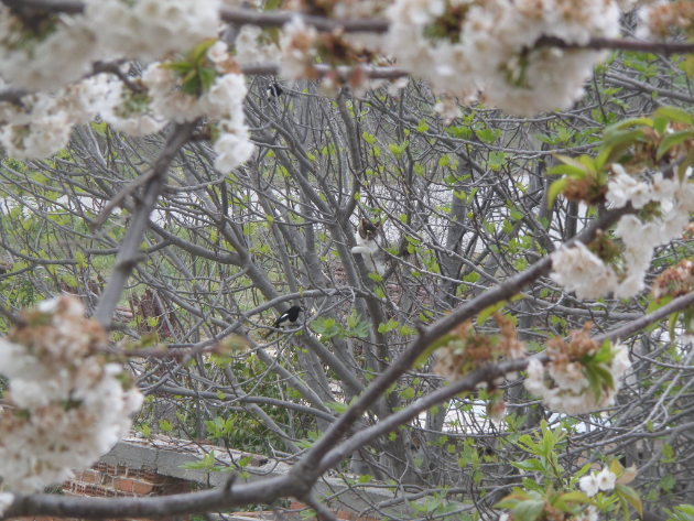 У нас на этом дереве каждую весну разные жильцы. Были вороны, совы, соколы, голуби, теперь вот сороки заехали. Гнездо поправляют, готовятся. Веточки наверх таскают. Обустраиваются. Лишь бы наши коты туда не повадились шляться.