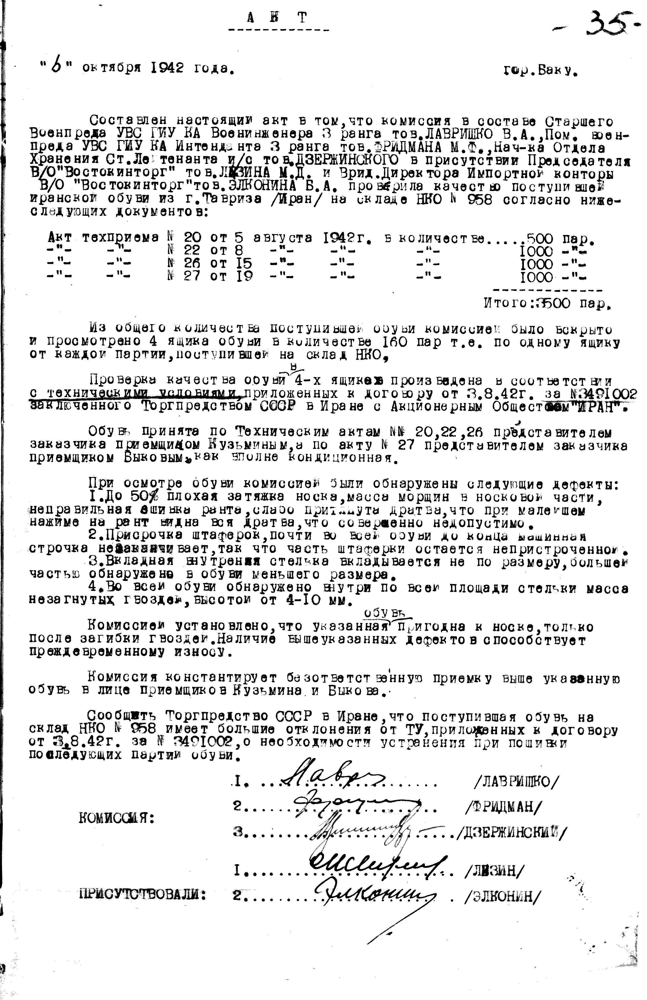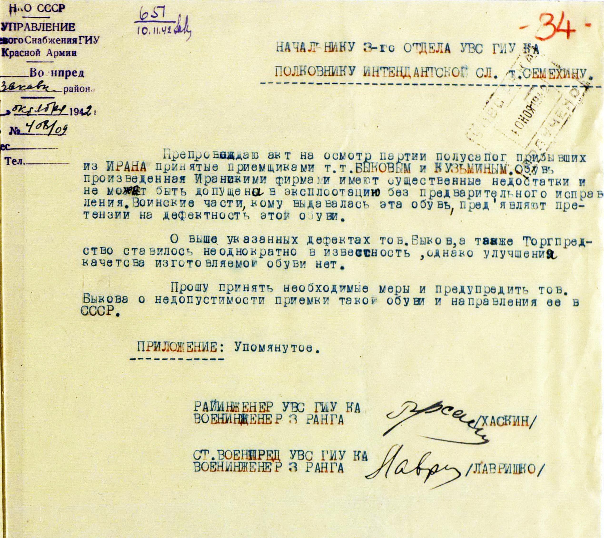 Но, проведённая в октябре 1942 г. проверка качества, поставленных в период с июля по август 1942 г. 1600 пар сапог, показала, что в изготовленной иранскими предприятиями обуви немалый процент брака.