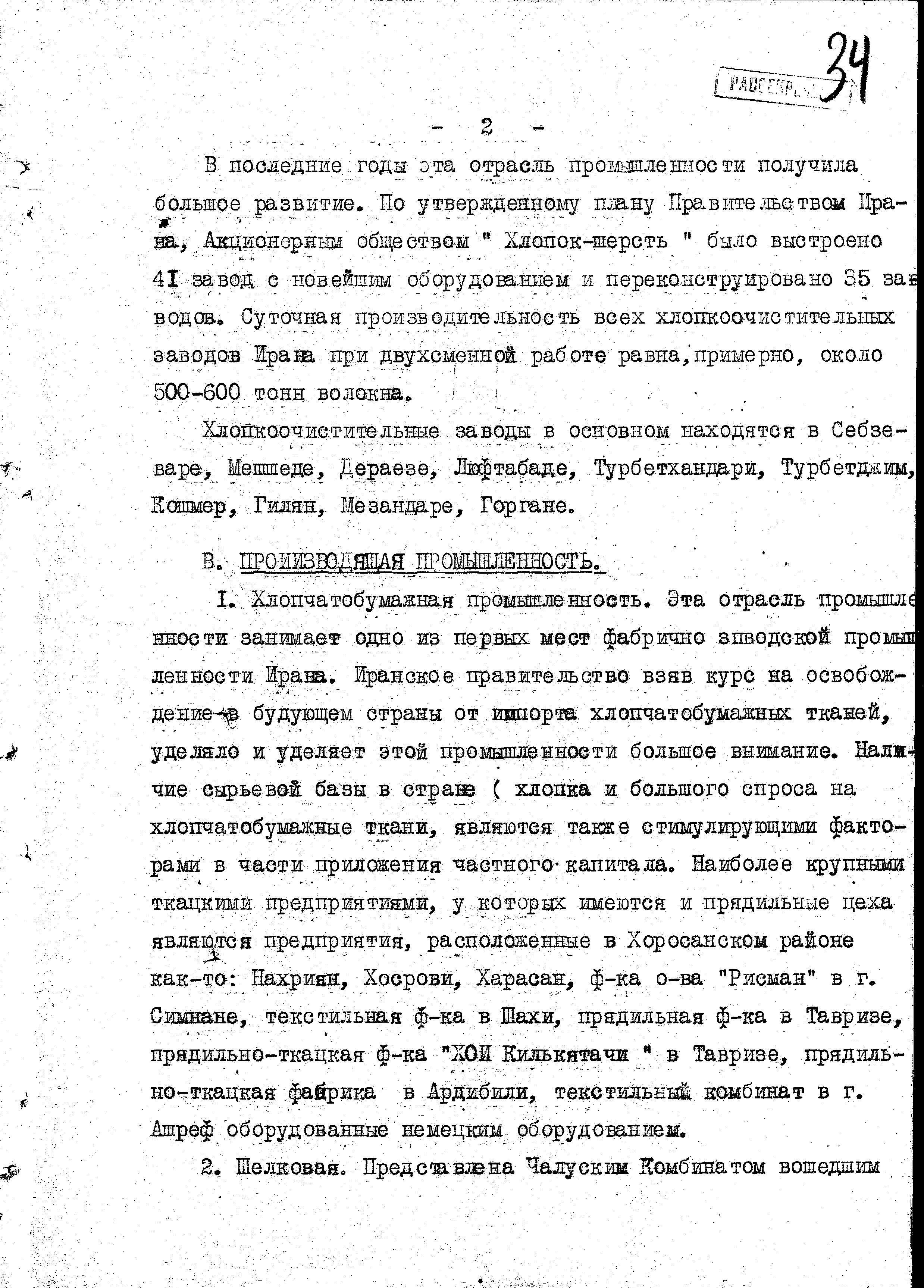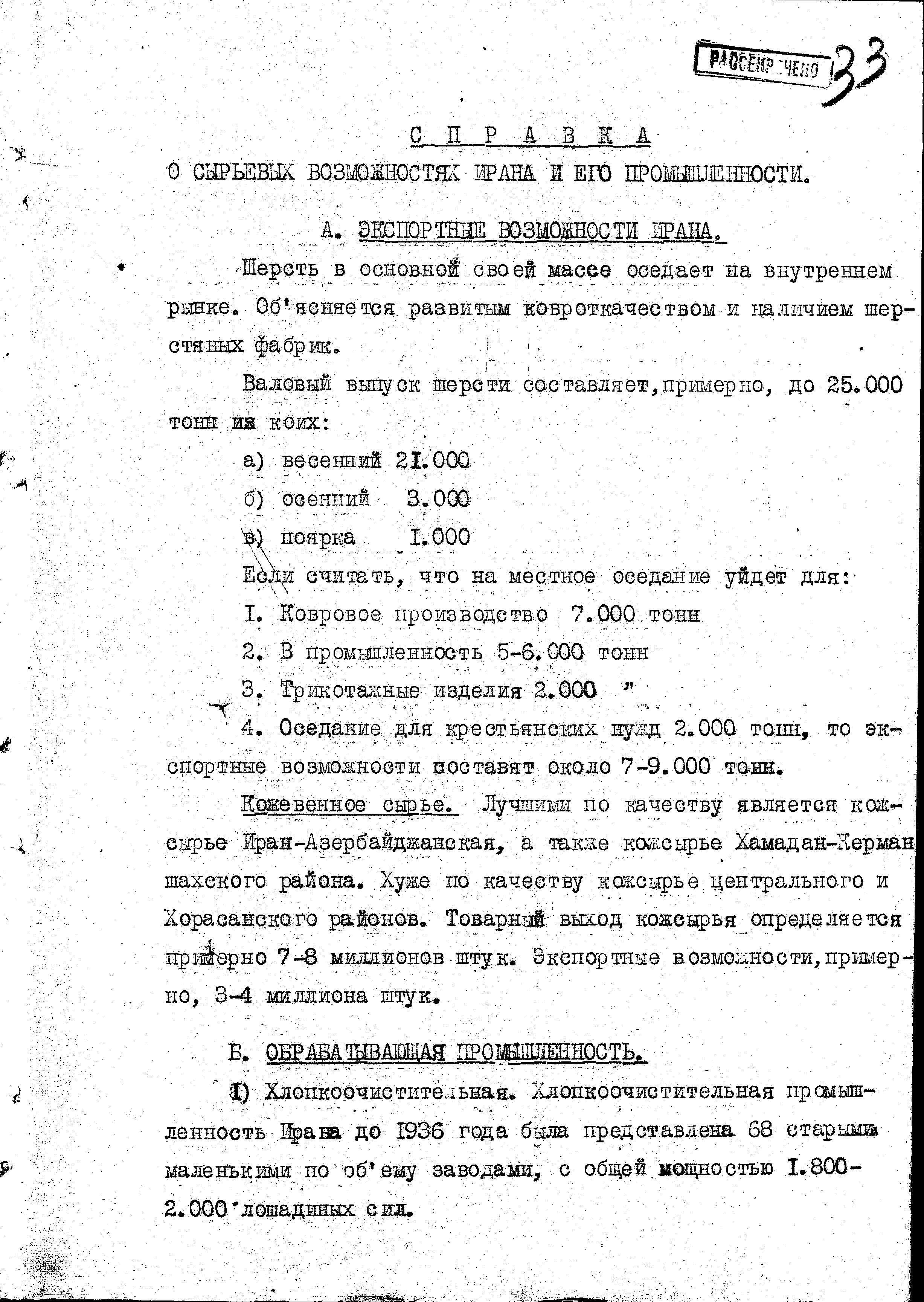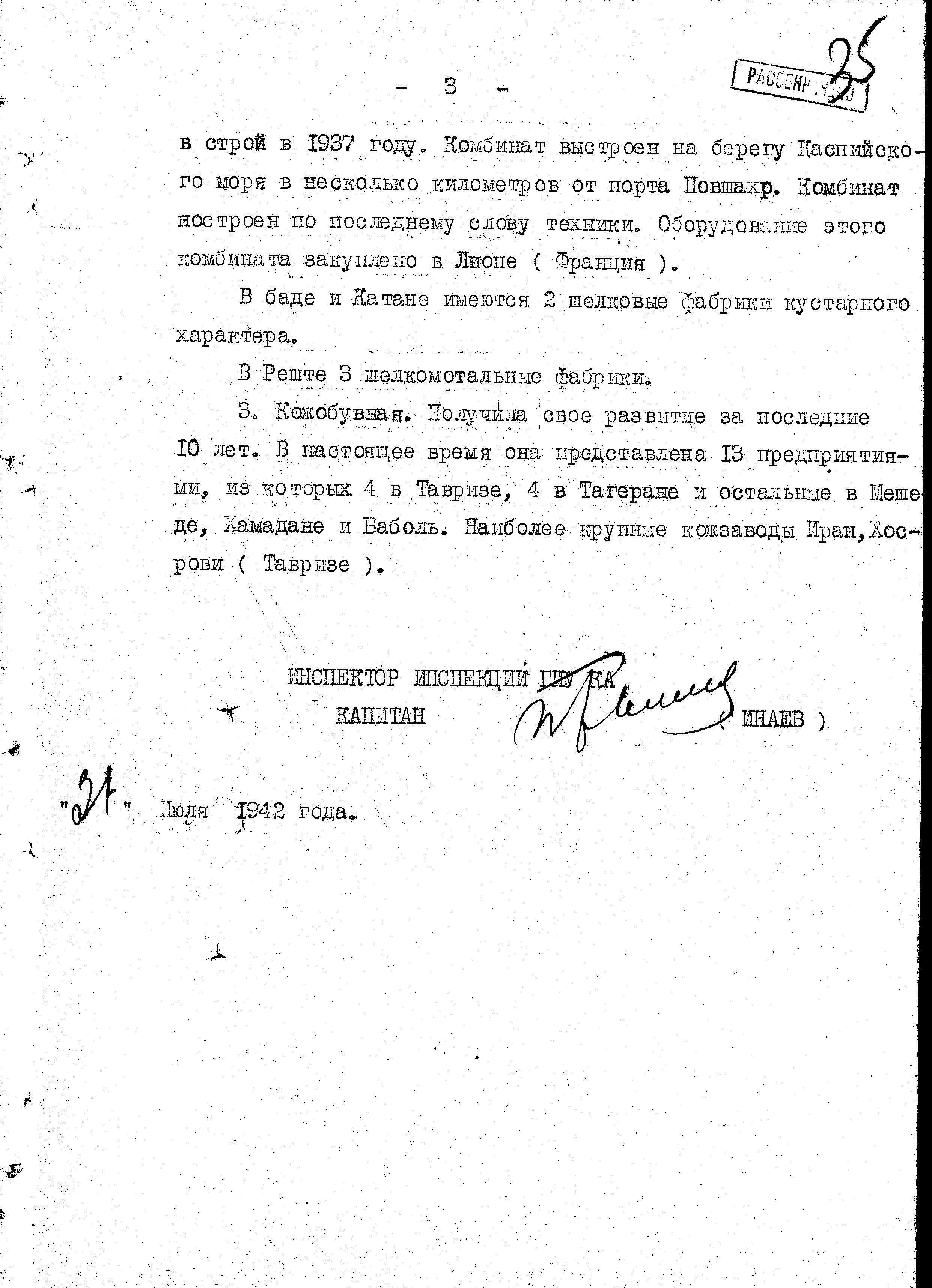 Про какие-либо поставки продукции, изготовленные в самом Иране, информации почему-то не встречалось. А это достаточно странно, для страны, у которой была своя лёгкая (хлопковая, шелковая и обувная) и пищевая промышленность. Во всяком случае, представитель Управления вещевого снабжения РККА, направленный в Иран для проверки советских войск, дислоцированных в Иране, составил очень интересный документ, справку о сырьевых возможностях Ирана и его промышленности