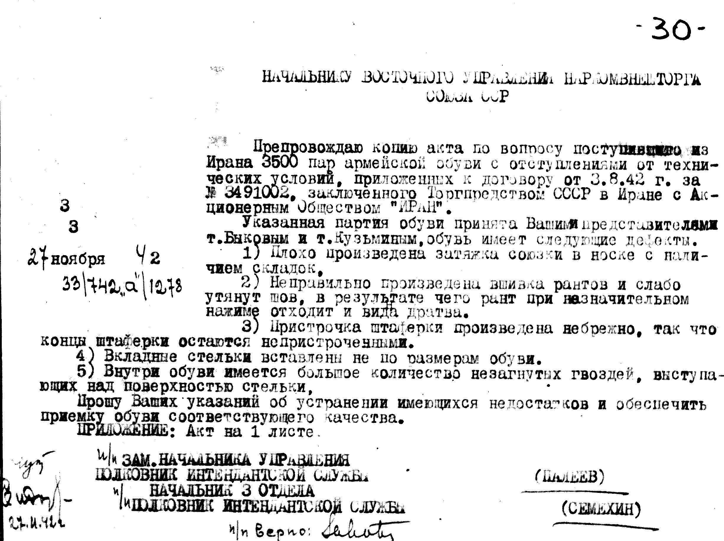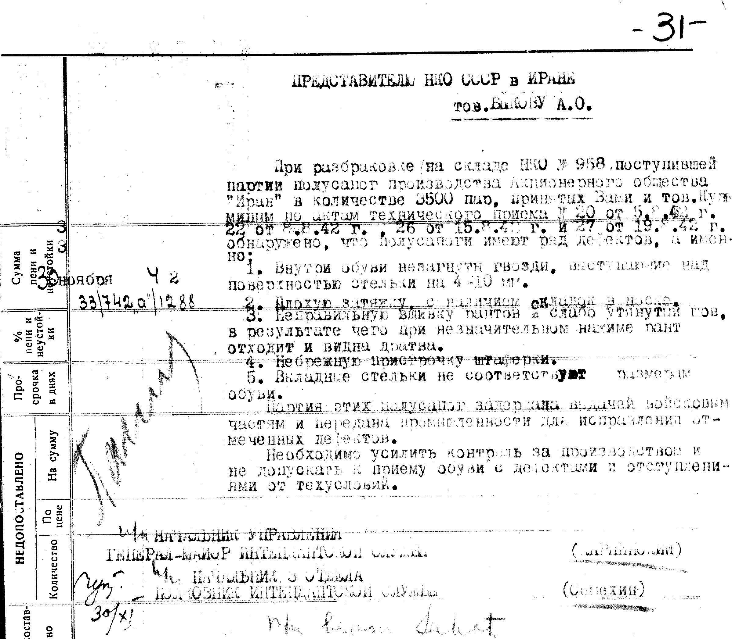 Несмотря на нелестные отзывы представителей Наркомата обороны, поставки иранской стороной сапог продолжались. Правда, качество обуви по-прежнему оставляли желать лучшего, вопреки утверждениям, никаких мер Торгпредством по устранению дефектов так и не было принято.