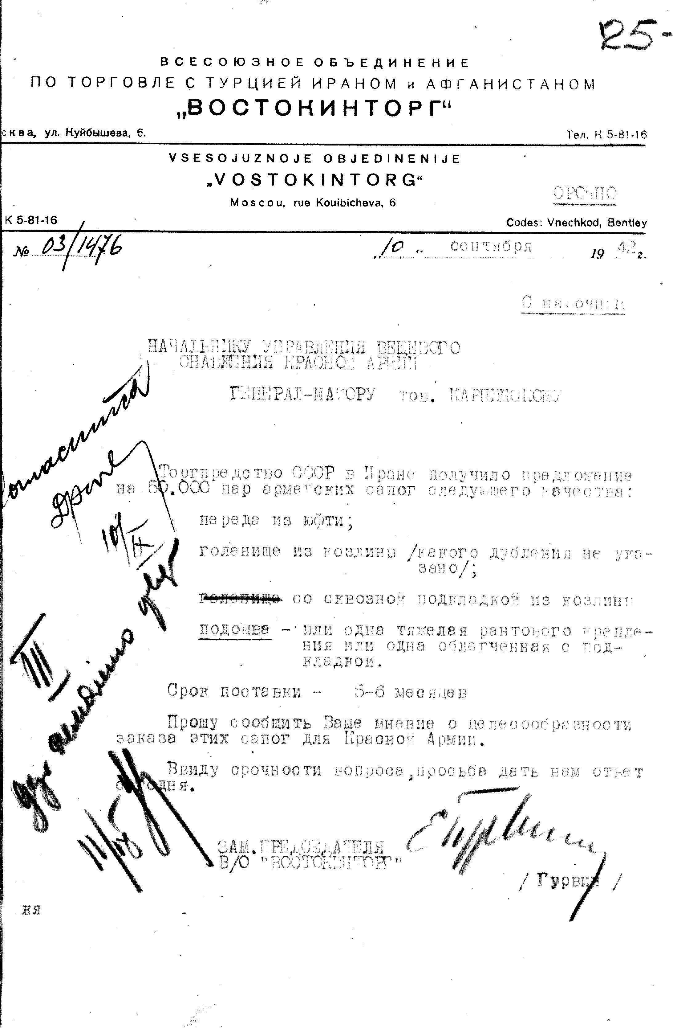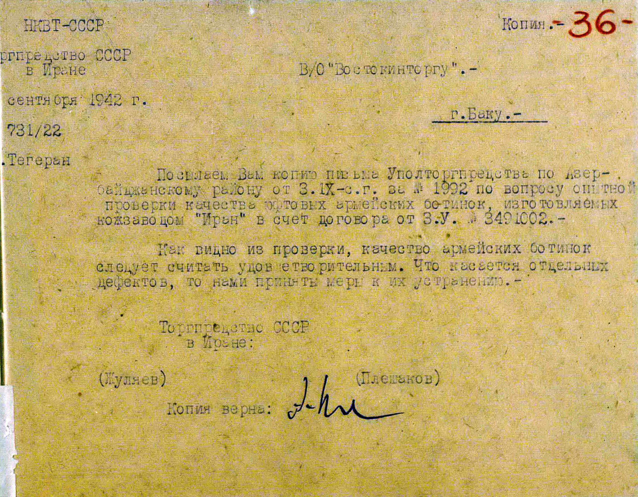 В августе 1942 г., Торгпредство СССР в Иране заключило договор с Акционерным обществом «Иран» об изготовлении обувной промышленностью Ирана и поставке в Советский Союз партии в 50 тыс. пар сапог для нужд Красной Армии.
