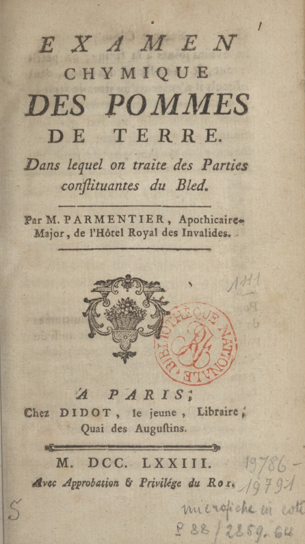 Титульный лист книги Пармантье "Химическое исследование картофеля". 1773 год.