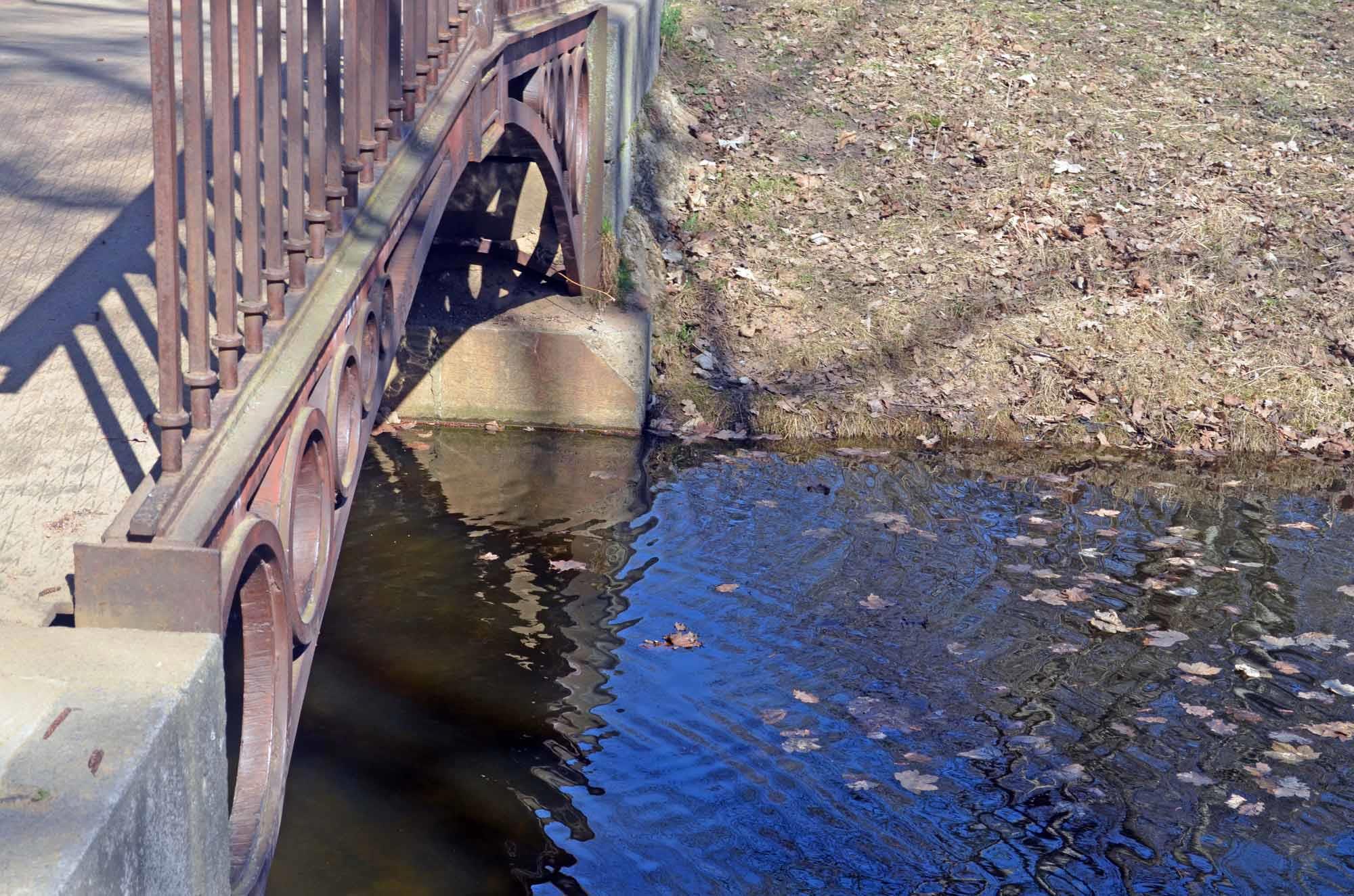 Вид на пруд и железный мостик: