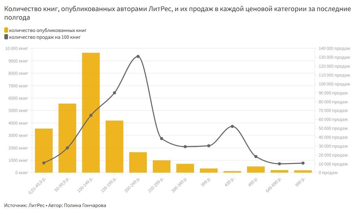 Популярностью пользуются книги за 439 рублей (обратите внимание на вторую «горку» серой линии) — в основном это специализированная, нон-фикшн литература.