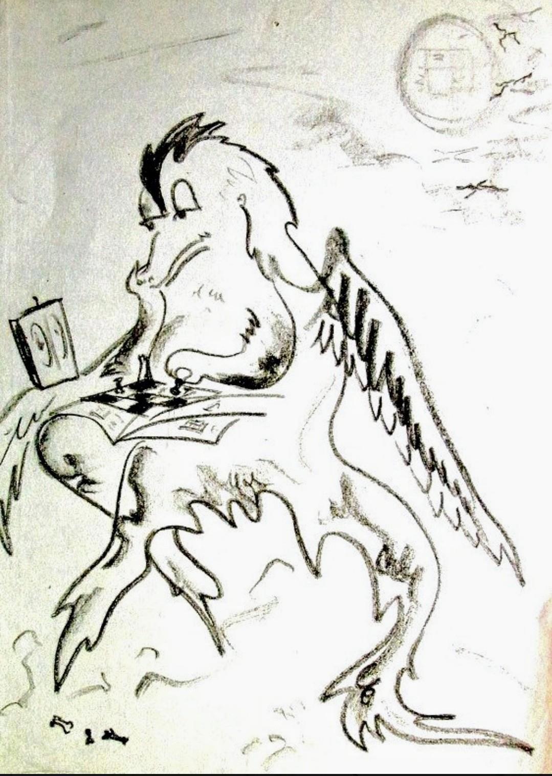 Какая славная работа. Чуть ли не одним росчерком. Грустный дракончик играет в шахматы сам с собой. На время! Грустное и смешное рядом.