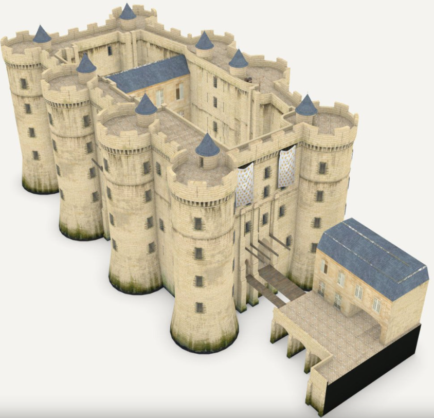 Строительство Бастилии, или бастиды (укрепления) началось в 1370 году. Крепость построили, чтобы защищать во время Столетней войны восточную сторону Парижа от английских и бургундских войск. Опасаясь врагов, Карл V Мудрый приказал расширить Бастилию, так что сооружение превратилось в укрепленный замок и стало ключевым форпостом Парижа. Крепость 70 м в длину и 30 – в ширину при толщине башенных стен 3 м не только прочно защищала Париж, но и одновременно укрывала монархов во время народных волнений и междоусобиц. Восемь пятиэтажных полукруглых башен, соединенных стенами и оснащенных пушками, обороняли четырехугольное здание Бастилии. Главный вход защищен двойной линией рвов шириной 24 м с подъемными мостами.