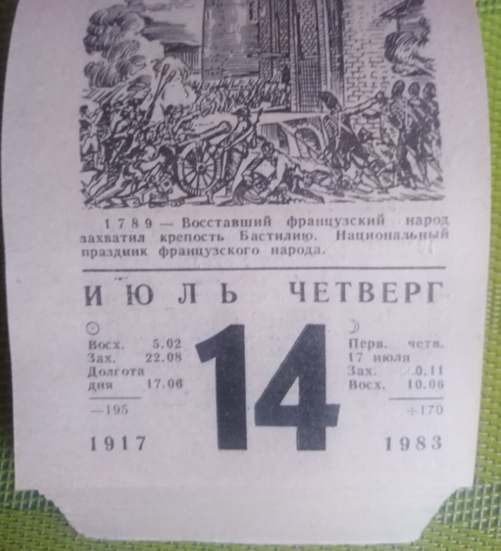 Хотя по сути, на самом деле во Франции никто не называет этот день «День взятия Бастилии». Французы зовут его La Fête Nationale или Le Quatorze Juillet («Национальный праздник» или «Четырнадцатое июля», соответственно). В этот день в 1789 году, во время Великой французской революции, восставшие парижане взяли штурмом, а потом еще и разрушили, крепость-тюрьму Бастилию, которую революционеры считали символом тирании Бурбонских монархов. При этом толпа захватившая крепость жестоко расправилась и с комендантом Бастилии и с некоторыми офицерами, но об этом особо не упоминается в дальнейшем. В последствии сама крепость была разобрана в течении нескольких месяцев, сейчас на месте Бастилии большой транспортный круг — развязка с Колонной Бастилии в центре.