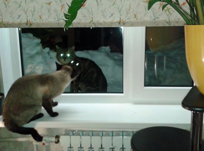 Без фотошопа. Коты полярной ночью))). Отражение на стекле фосфорических глаз нашего Рихарда - огонь!