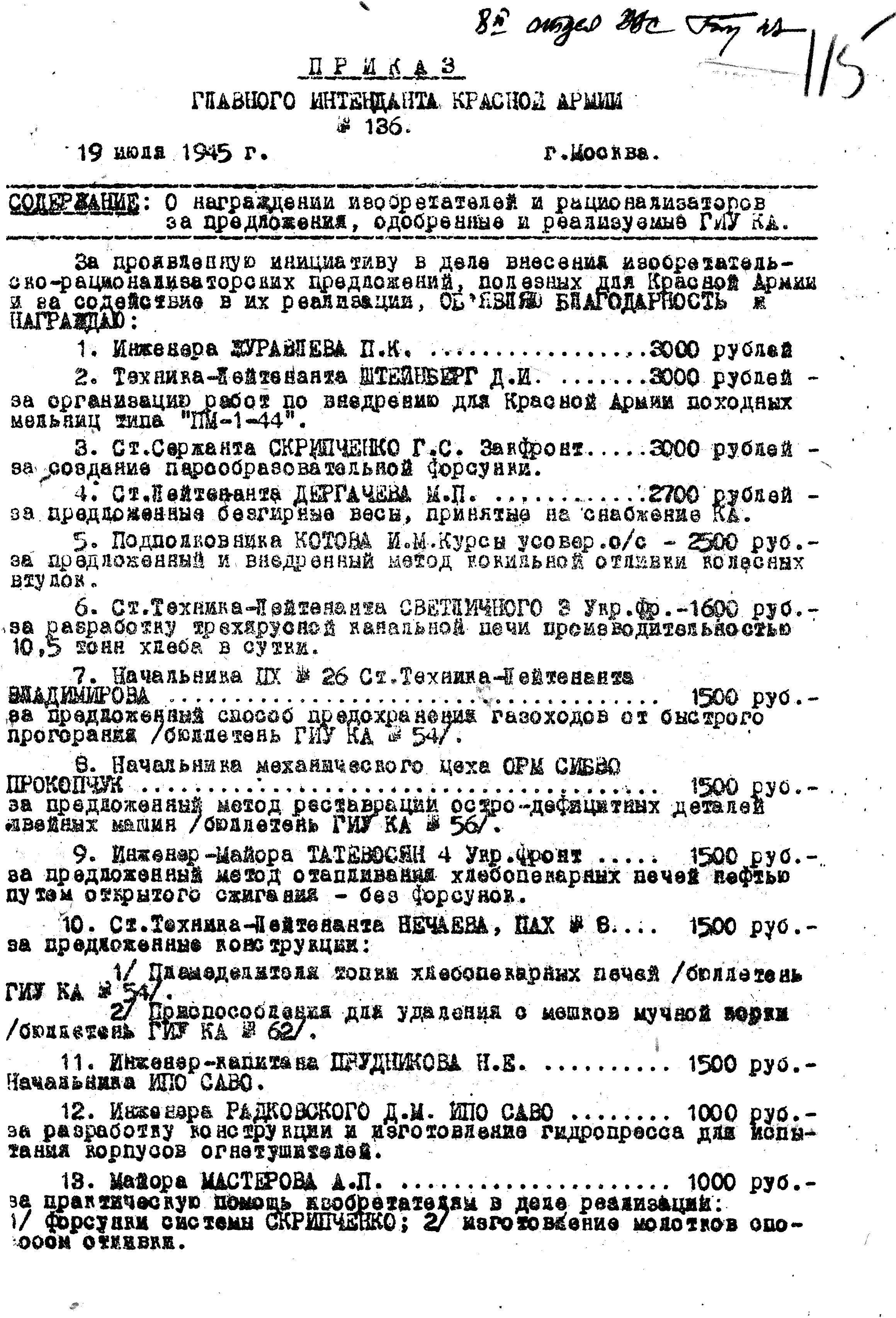 д/с: Приказ Главного Интенданта Красной Армии от 19.07.1945 г. № 136 «О награждении изобретателей и рационализаторов за предложения, одобренные и реализуемые ГИУ КА»![]()