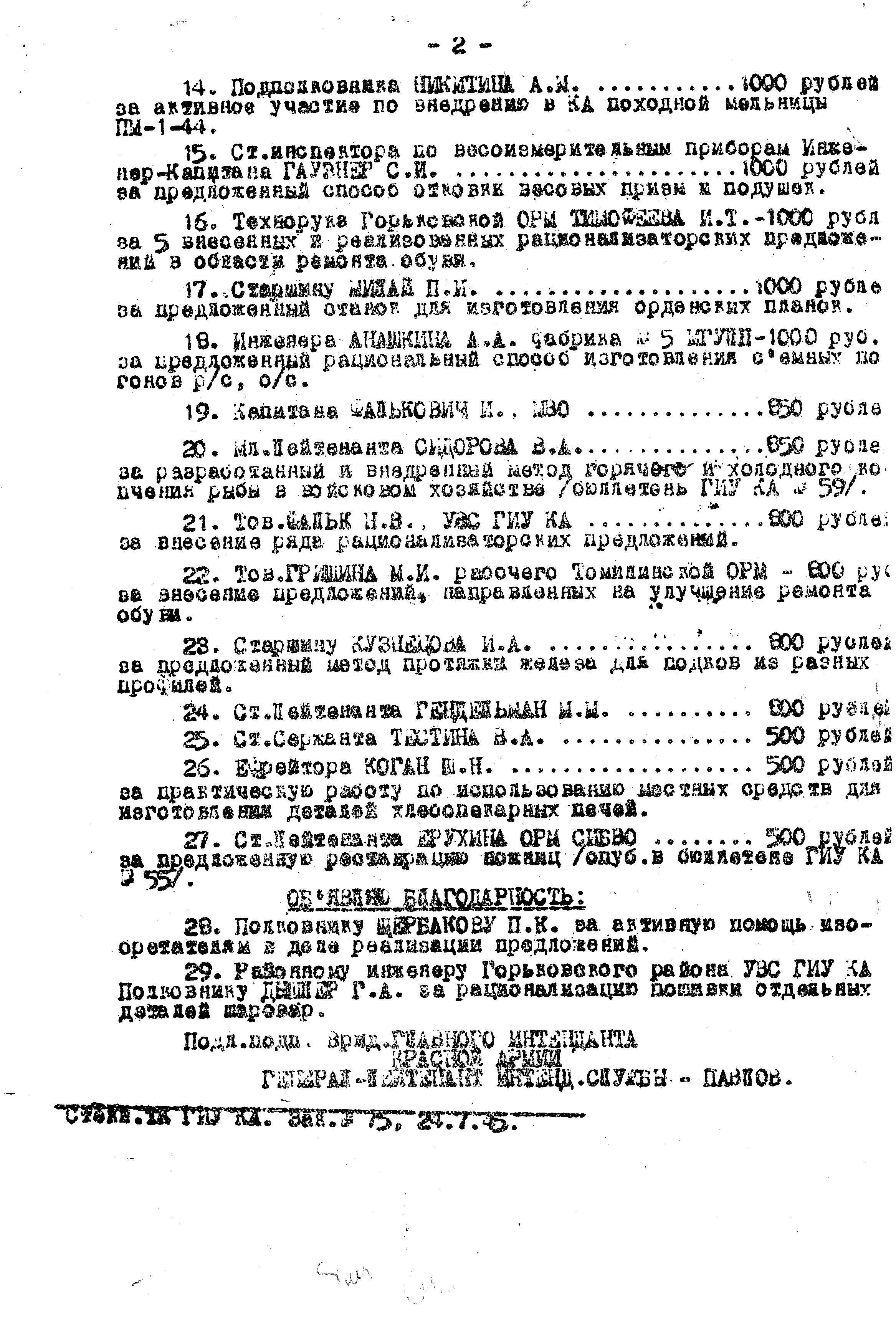 Но, не были забыты и другие участники конкурса, не занявшие призовых мест, но подавшие дельные, нужные армии и стране, предложения. В июле 1945 г. был издан ещё один приказ о поощрении ещё 27 участников.