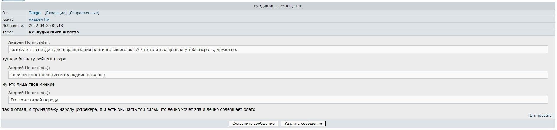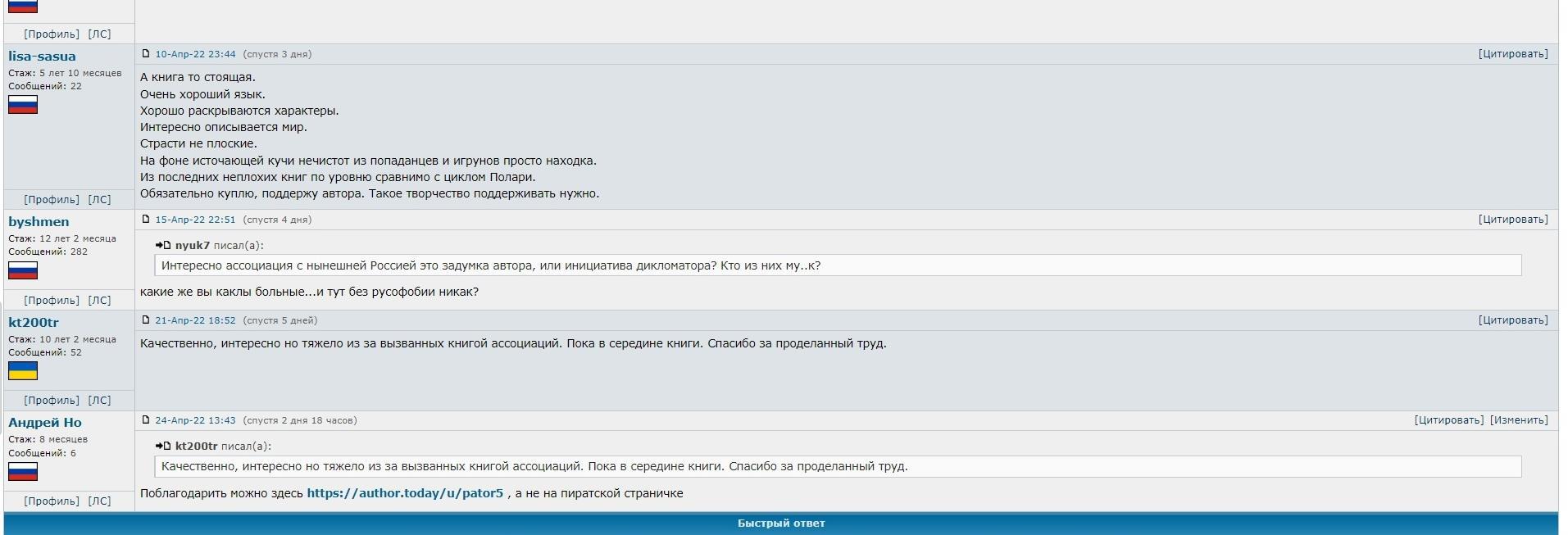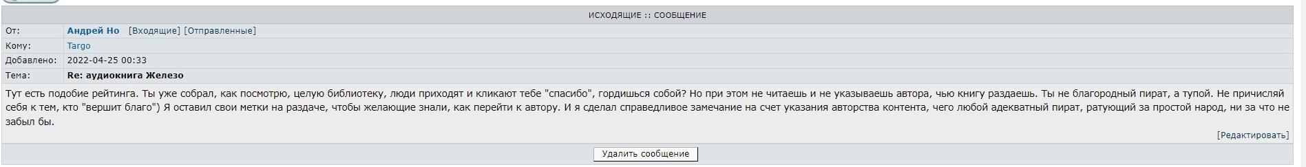 Тут есть подобие рейтинга. Ты уже собрал, как посмотрю, целую библиотеку, люди приходят и кликают тебе "спасибо", гордишься собой? Но при этом не читаешь и не указываешь автора, чью книгу раздаешь. Ты не благородный пират, а тупой. Не причисляй себя к тем, кто "вершит благо") Я оставил свои метки на раздаче, чтобы желающие знали, как перейти к автору. И я сделал справедливое замечание на счет указания авторства контента, чего любой адекватный пират, ратующий за простой народ, ни за что не забыл бы.