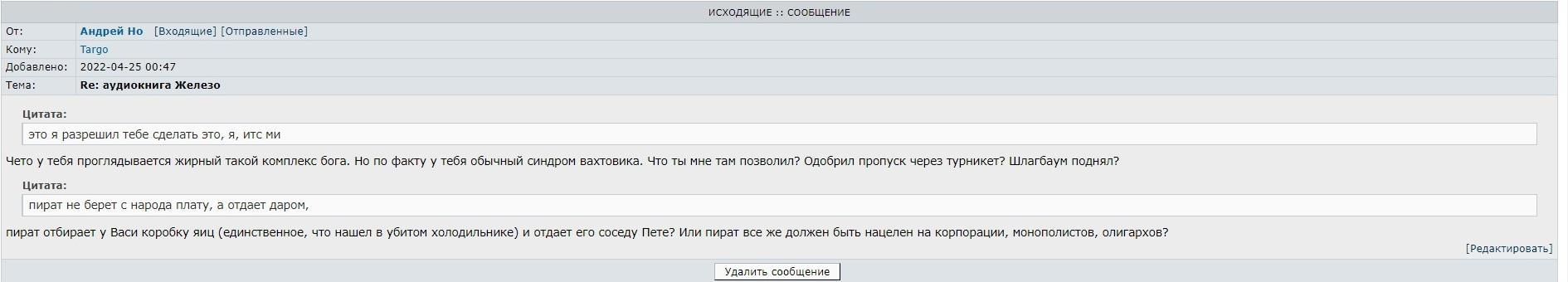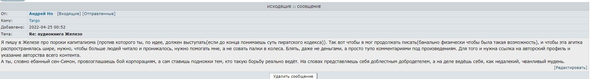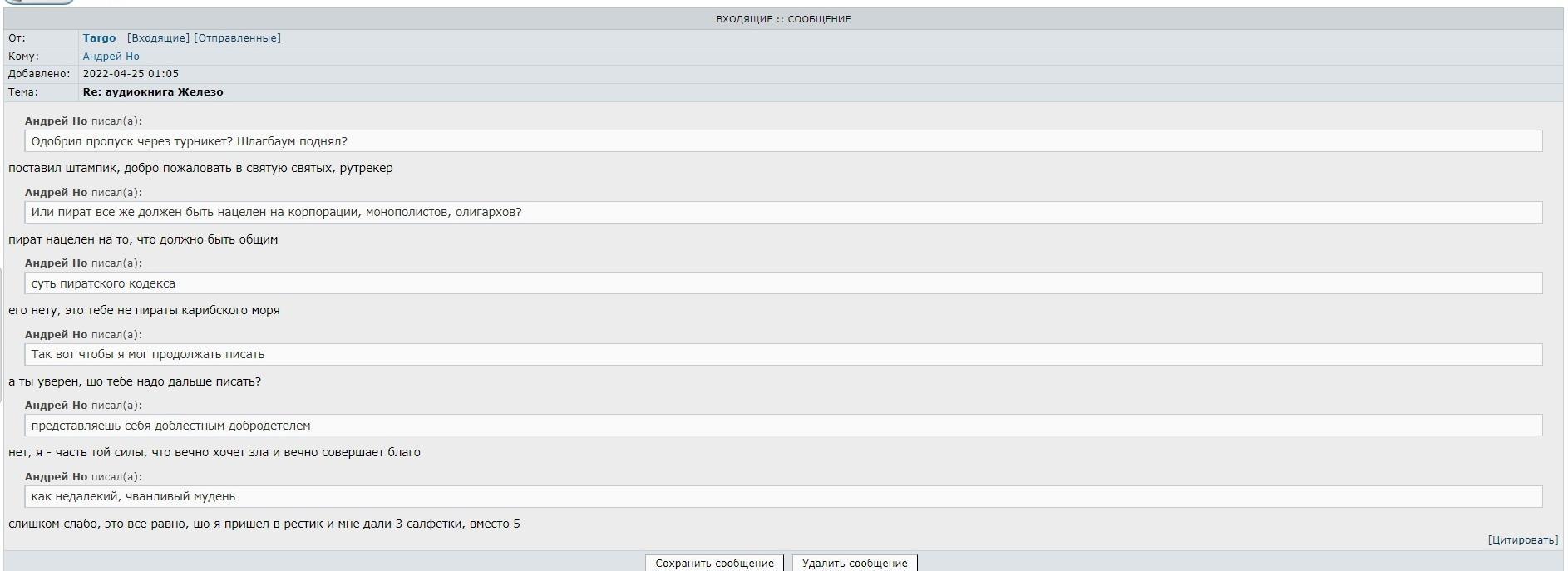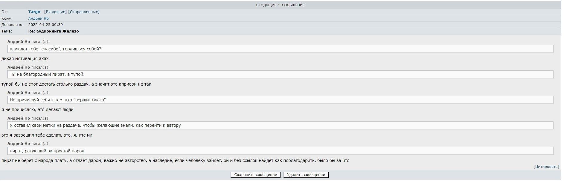 Встретить свою книгу на пиратском ресурсе — ощущение не из приятных, но в общем-то из уже привычных. Пираты бывают разные: стыдливые, наглые, предприимчивые (ворующие проды в день выхода и продающие их по подписке, Царенко про одного такого писал), а еще порой встречаются с комплексом бога, истинно верующие в свою значимость, но (вот противоречие!) презирающие то, что, по их мнению, делает их значимыми. Про одного такого кадра сегодня и пойдет речь.