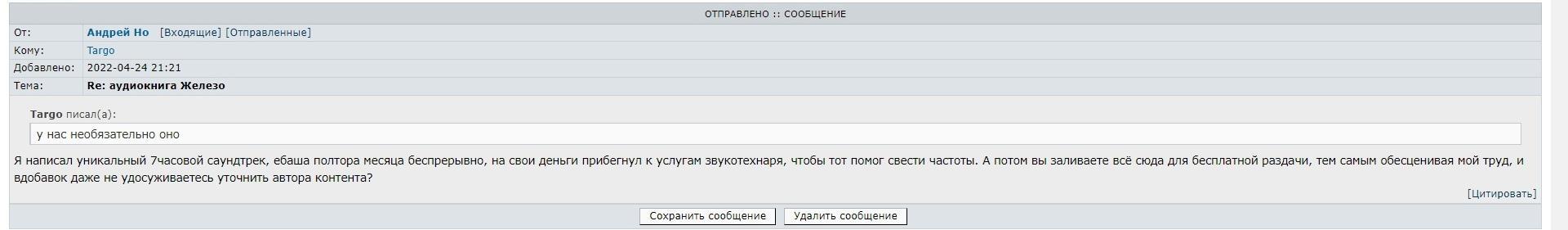 Подытожим. Некий Targo с рут-рекера врывается в мою работу, которую я пытаюсь худо-бедно окупить, отбирает ее и раздает бесплатно. На вопрос — в чем мне резон продолжать создавать товар дальше, если ты сводишь мои усилия на нет? — глумливо отвечает: а ты уверен, что тебе твое говно, которое я даже не читал, надо создавать дальше?