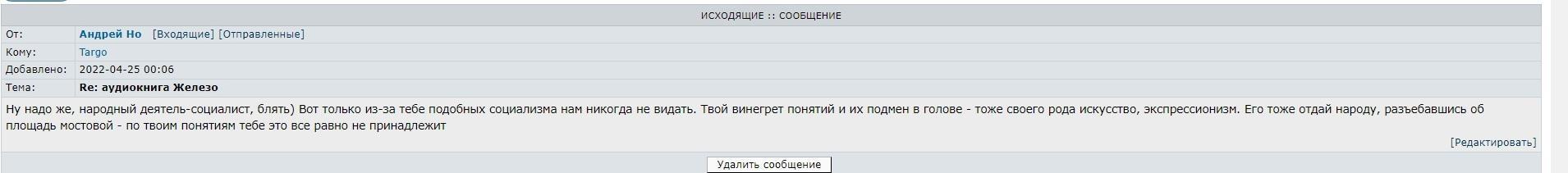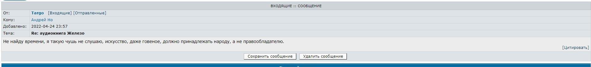 А авторы для него — жалкие дегенераты, чьи высеры не являются их собственностью, поэтому надо отбирать, даже если противно прикасаться, и раздавать народу ради самого факта раздачи. Как это бьет по самим создателям книг, которых он наворовал целую библиотеку, как это бьет по их мотивации продолжать титаническую интеллектуальную работу, его не колышет.