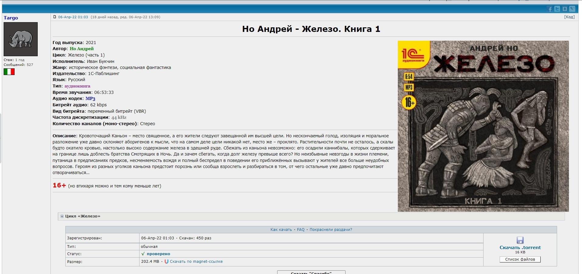 Захожу я как-то на популярный пиратский ресурс посмотреть, не появилось ли там чего нового с моим именем. Смотрю — появилось. Запущенная фальстартом аудиокнига Железо 1, которая провалилась на литрес из-за череды технических и человеческих ошибок, по идее, не должна была стать целью пиратов, которых соблазняют жирные раздачи. Но в конце марта я рекламил книжку здесь, на АТ — временный скачок читаемости наверняка и послужил сигналом к действию.