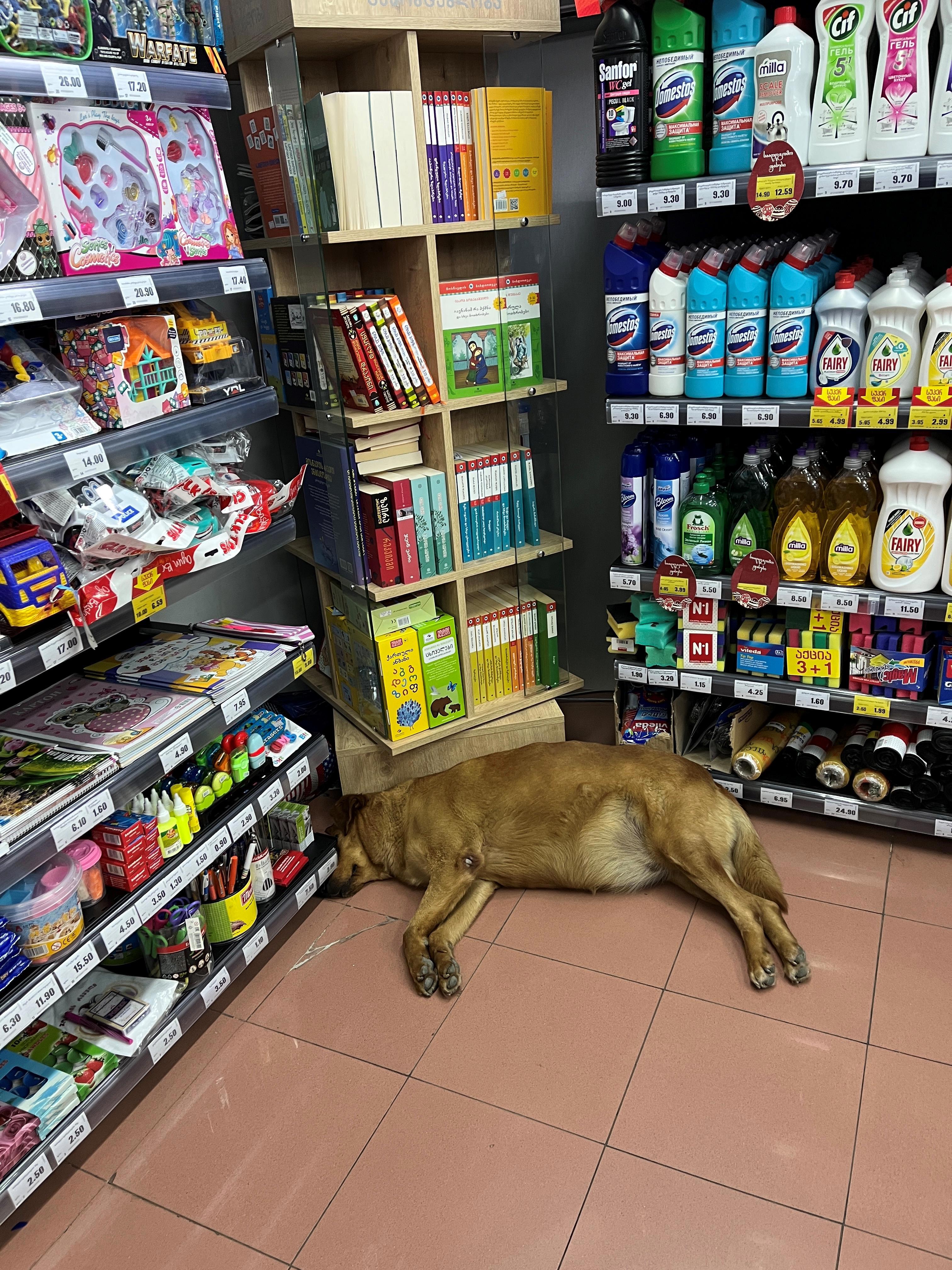 В супермаркете рядом с нашим отелем живёт бездомная собака. Всегда там спит среди прилавков.
