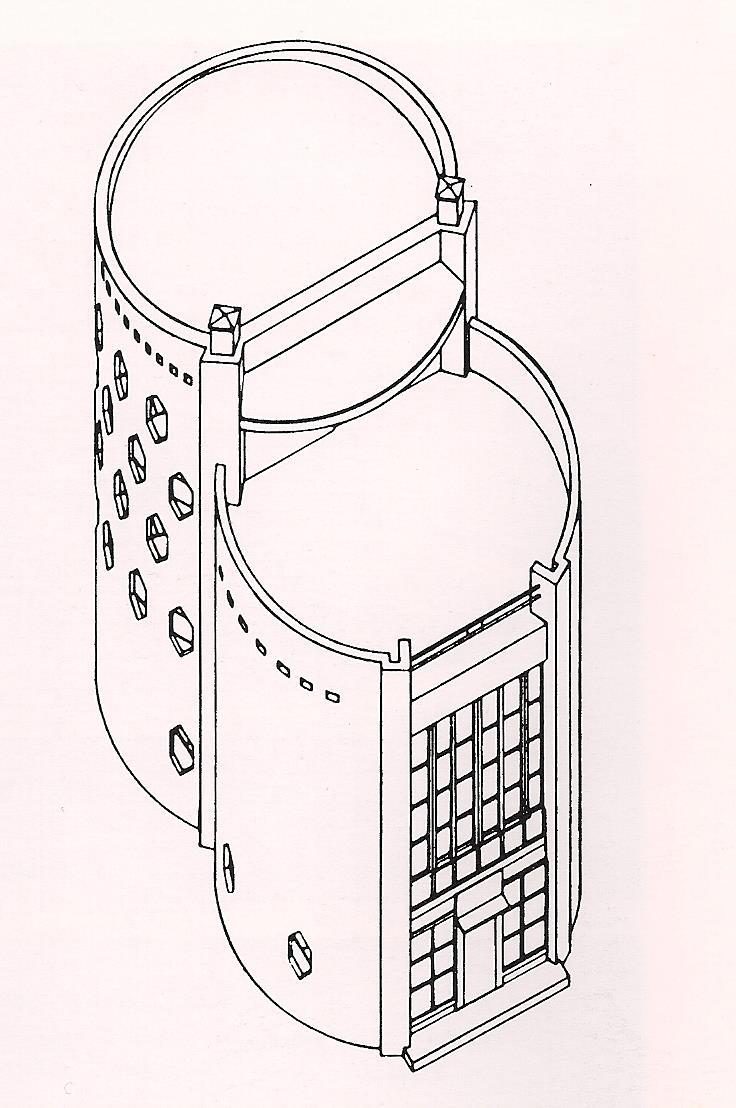 Как строил Мельников? Если это была коробка для гаража автобусного парка, то делал ее косоугольной - просто чтобы автобусам было удобнее заезжать и выезжать со стоянки, не делая крутых поворотов.