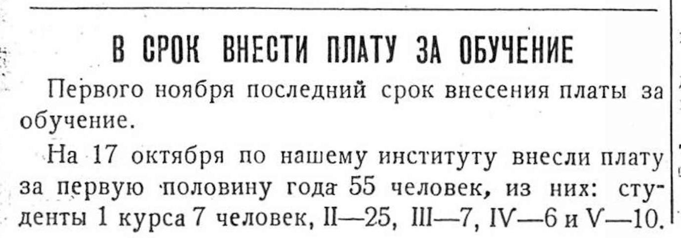 Высшее образование также прекращало быть бесплатным. Учеба в столичных вузах и вузах столиц республик обходилась студенту 400 рублей в год, другие города – 300 рублей. Дороже всего обходились театральные, музыкальные и художественные вузы – 500 рублей в год. Заочники и вечерники платили за обучение в половинном размере, военные училища оставались бесплатными.