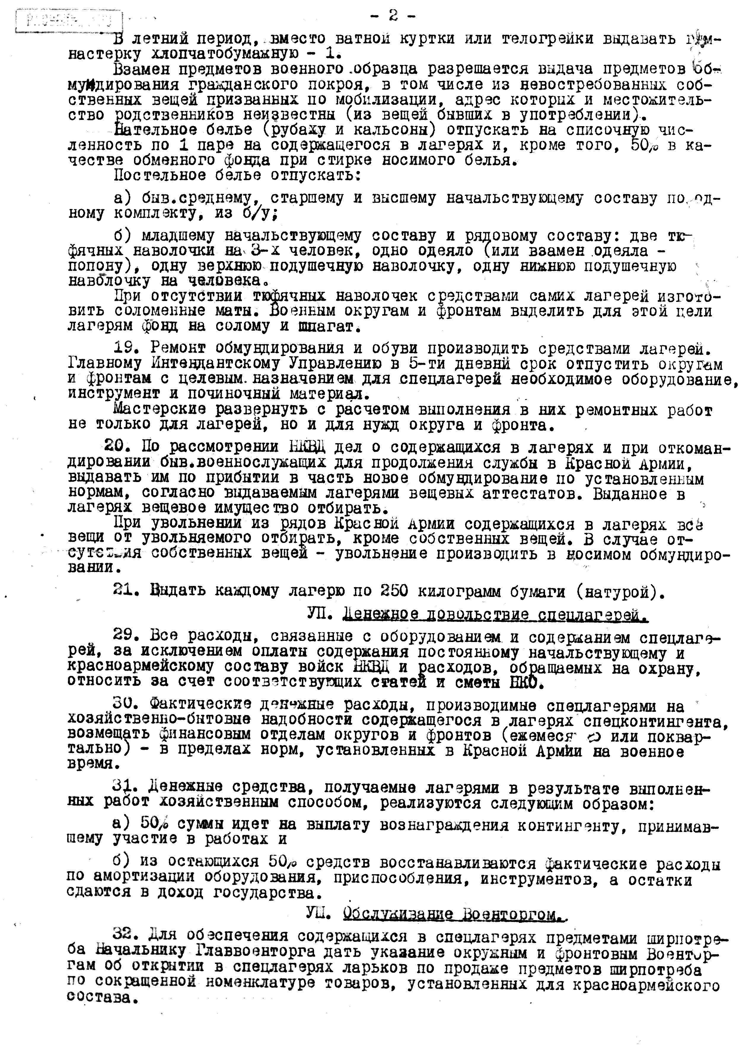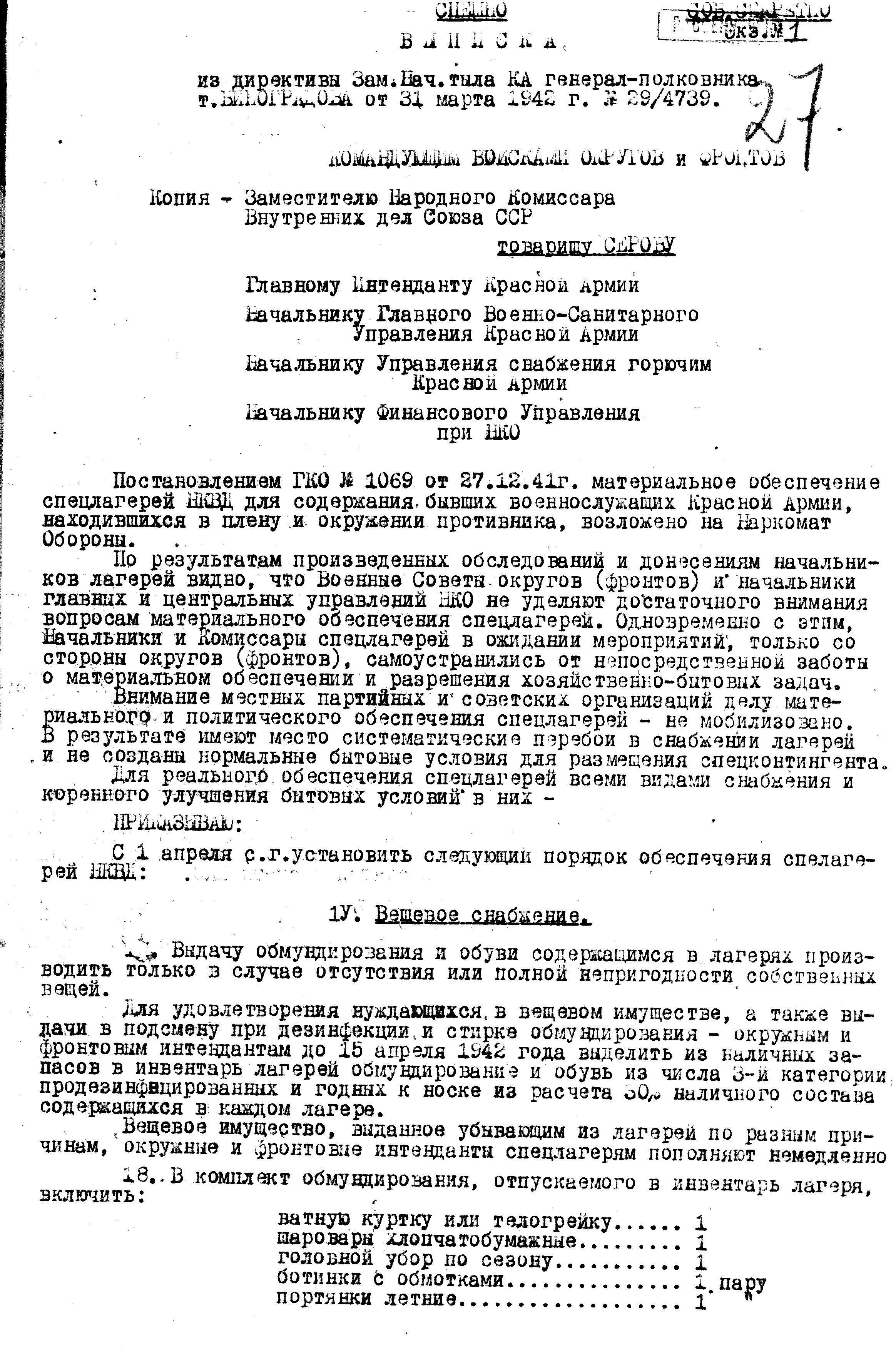 д/с: выписка из директивы зам. Начальники Тыла Красной Армии № 29/4739 по организации материального обеспечения спецлагерей НКВД![]()