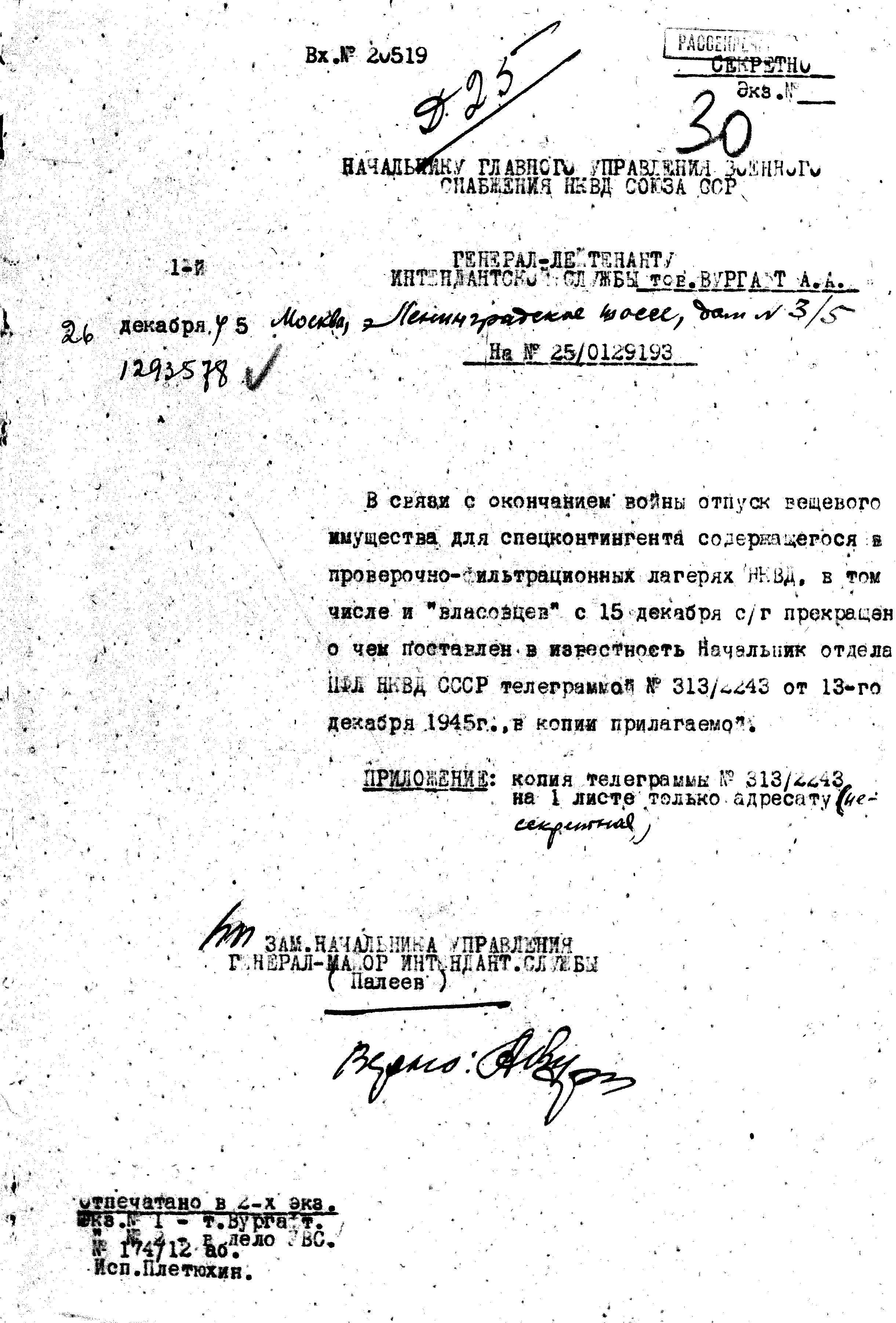 д/с: Обращение Начальника ГУВС НКВД СССР по вопросу обеспечения вещевым имуществом контингента «Власовцев»![]()