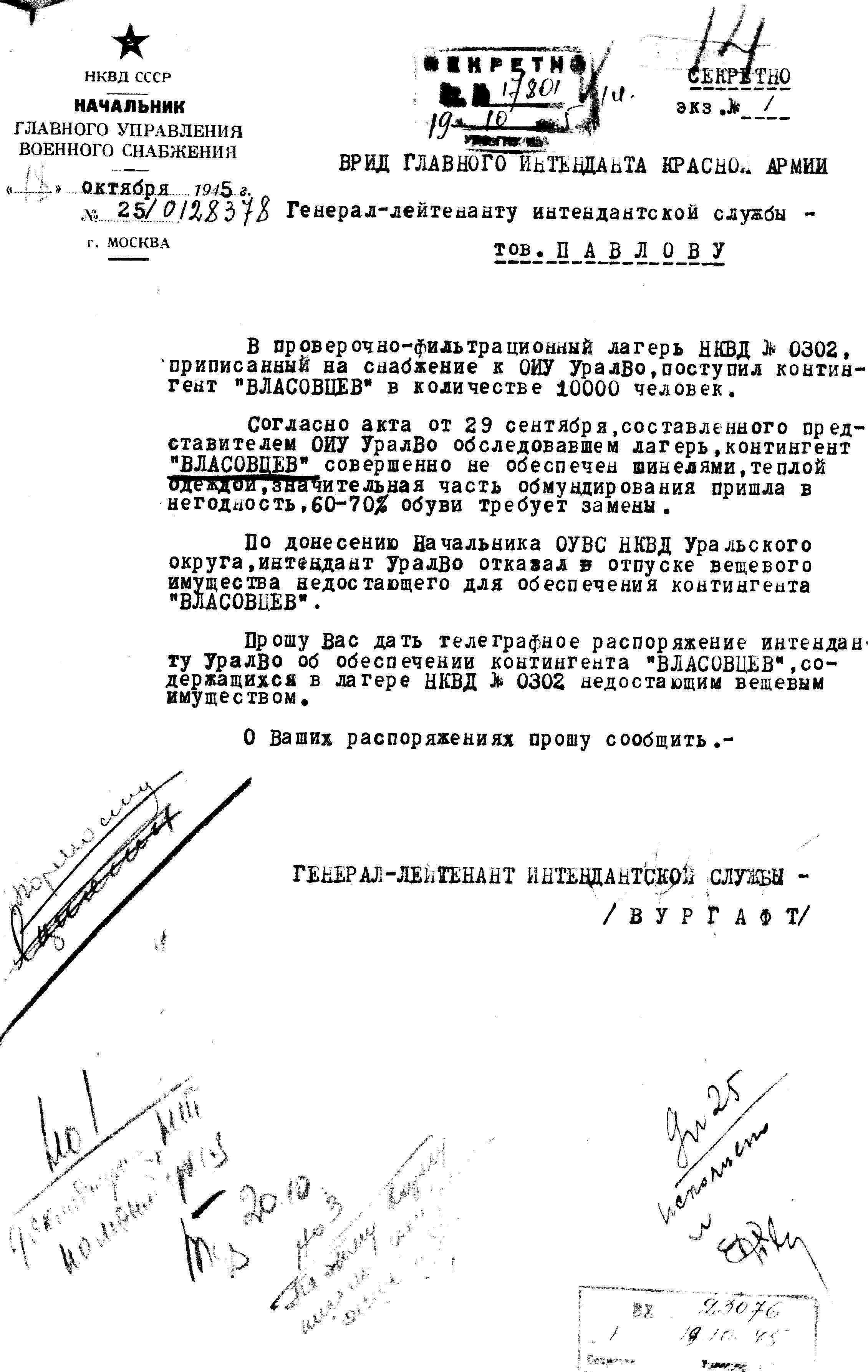 Прошу обратиь Ваше внимание на дату документа — 18 октября 1945 года. Прошло почти полгода со дня капитуляции гитлеровской Германии, а, как минимум 10 тысяч «власовцев» по-прежнему считаются «бывшими советскими военнослужащими», со всеми вытекающими плюсами и послаблениями. Выходит, если бы начальник отдела вещевого снабжения Уральского военного округа не отказался снабжать этот «контингент», то «власовцы» так и не стали бы заключёнными, и НКО продолжало их обеспечивать?