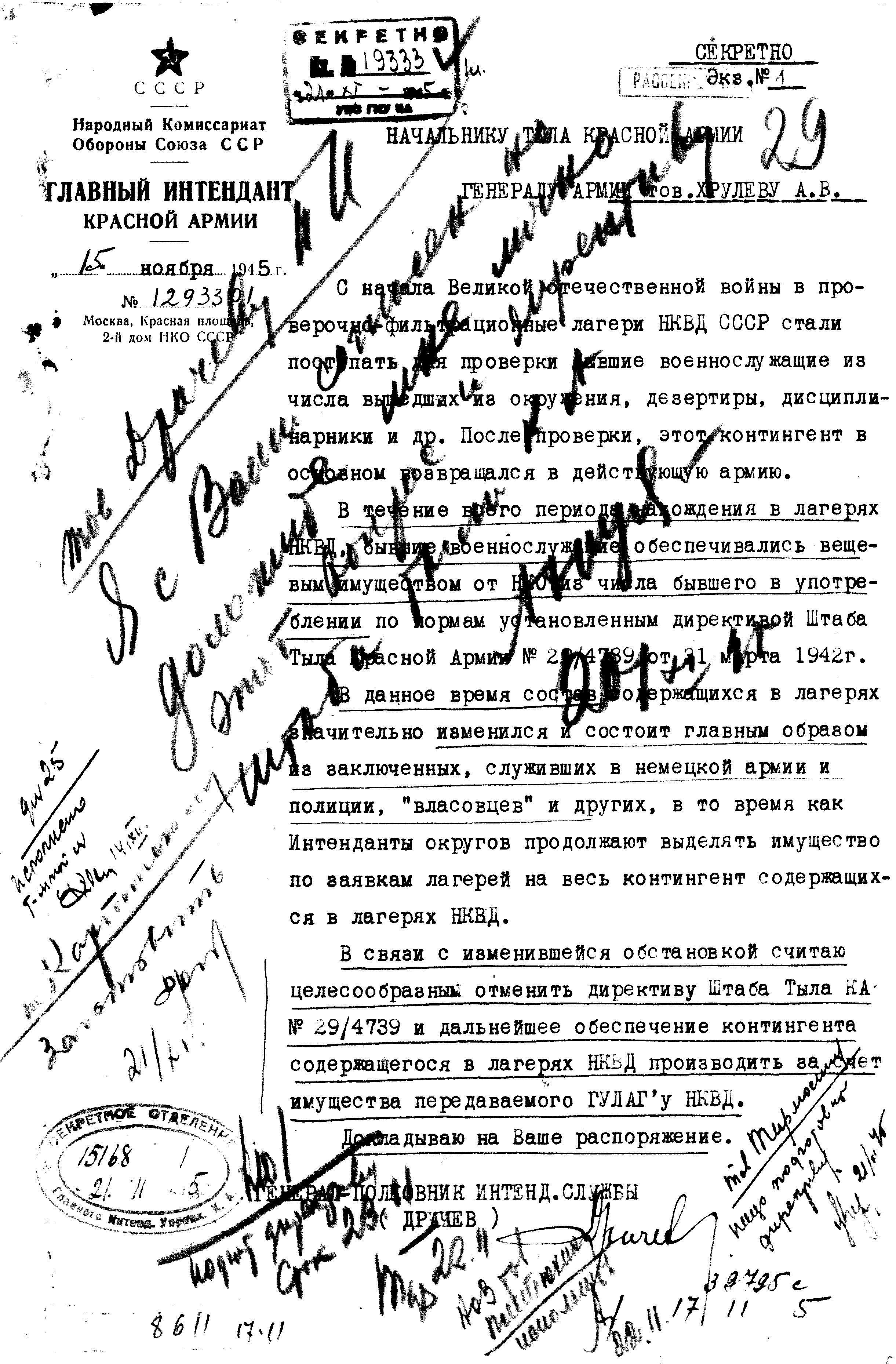 Думаю, что Главный Интендант Красной Армии генерал-полковник интендантской службы П.И. Драчёв тоже немало был удивлён подобному контингенту обеспечиваемых. С целью подготовки доклада Начальнику Тыла Красной Армии генералу армии А.В. Хрулёву, ГИнтУ направило запросы, о наличии в спецлагерях военных округов подобного контингента. 15 ноября 1945 года доклад был подготовлен и прдеставлен: