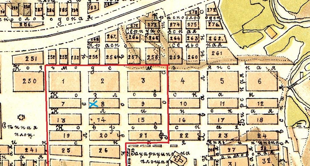Синим крестиком помечено примерное место расположения обсуждаемого здания. Красным обведена часть Города, носившая когда-то два разных названия: Ендовище и Таганы. Первые упоминания о Ендовище относятся к началу восемнадцатого века, когда оно ещё не только не входило в состав Города, но и было достаточно далеко от него - по другую сторону Царицы. Слова эти уже давно вышли из употребления, поэтому приходится объяснять их смысл: