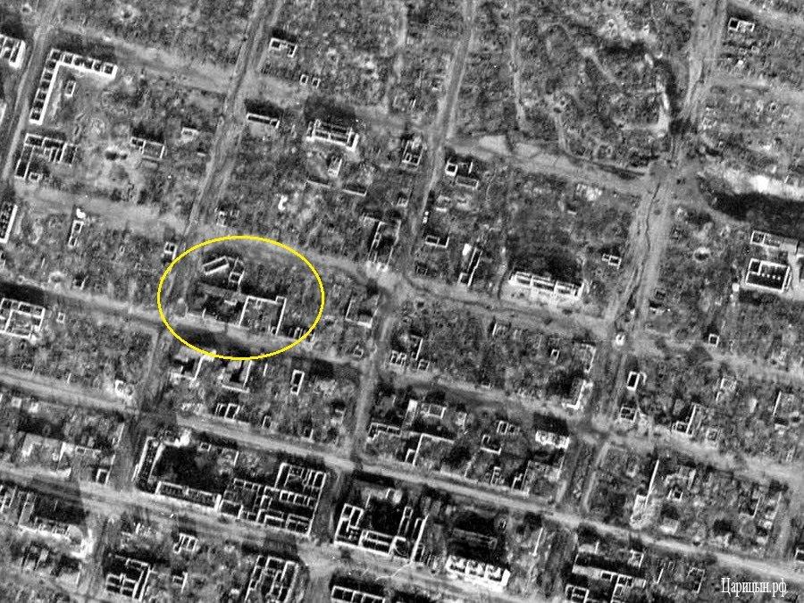 Овалом обведены постройки бывшего участка купца Амерханова. Обратите внимание на то, что одно из зданий стоит по диагонали - сориентировано одной стороной на север! Вот это и была бывшая мечеть! Её руины, как и руины многих других царицынских зданий, были снесены уже после войны при новой застройке Города.