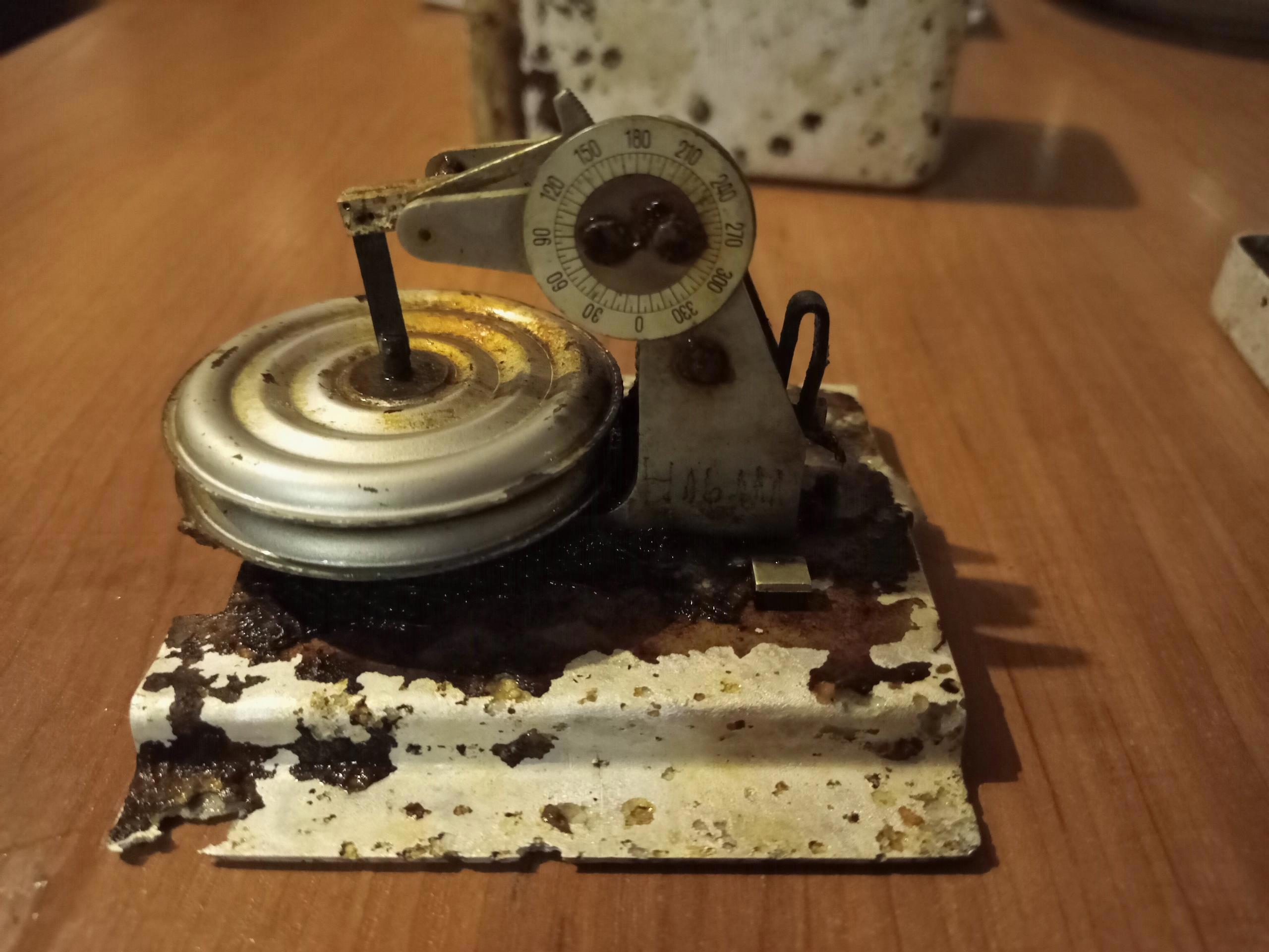 - Больше всего вопросов вызывает второй блок, судя по виду - чисто механический. Скорее всего, шкала настройки регулирует расстояние между этими рифлёными "блинами", хотя это и не сильно помогает понять их назначение. Также непонятно назначение алюминиевого корпуса, в который убран этот механизм.