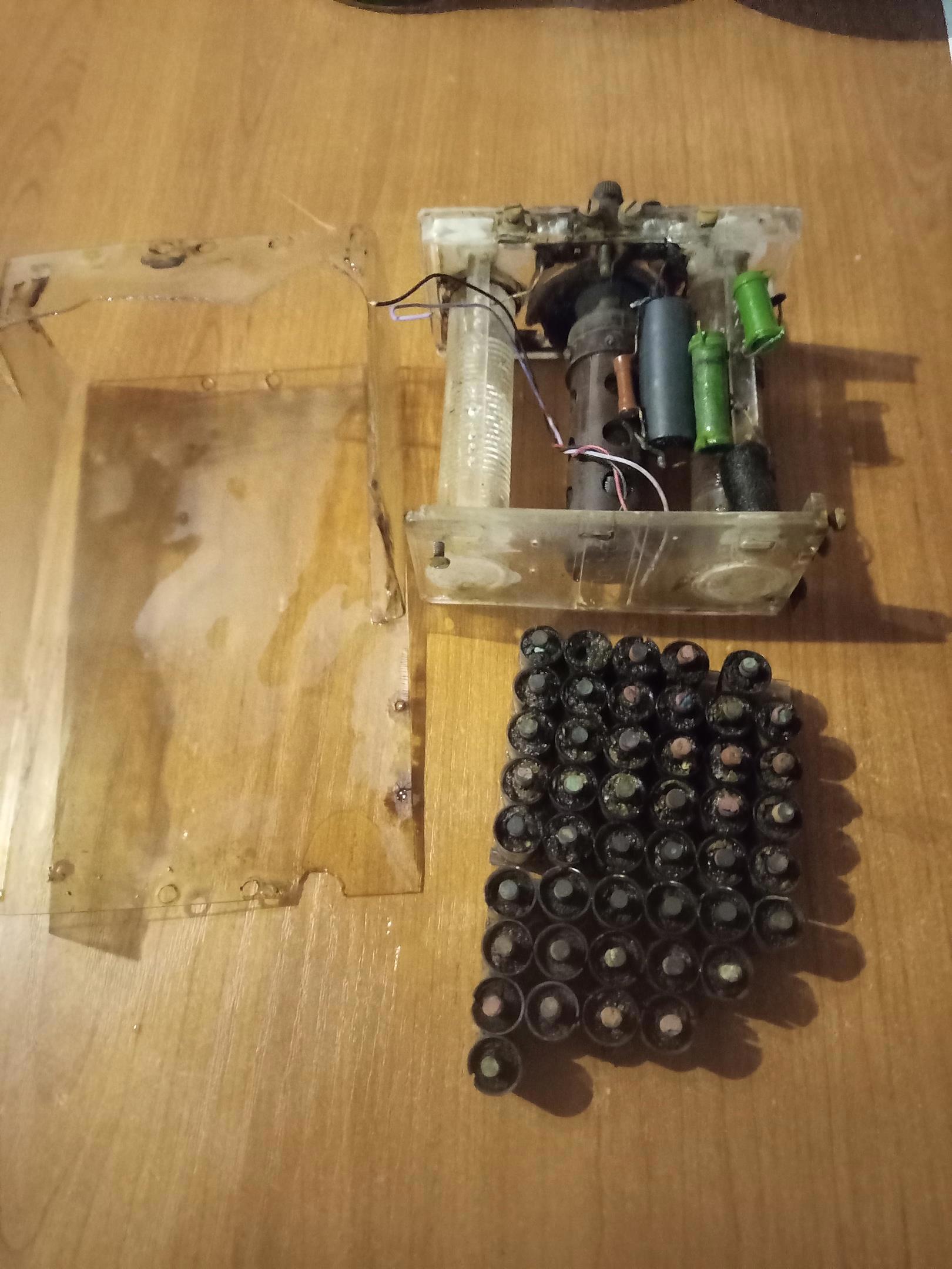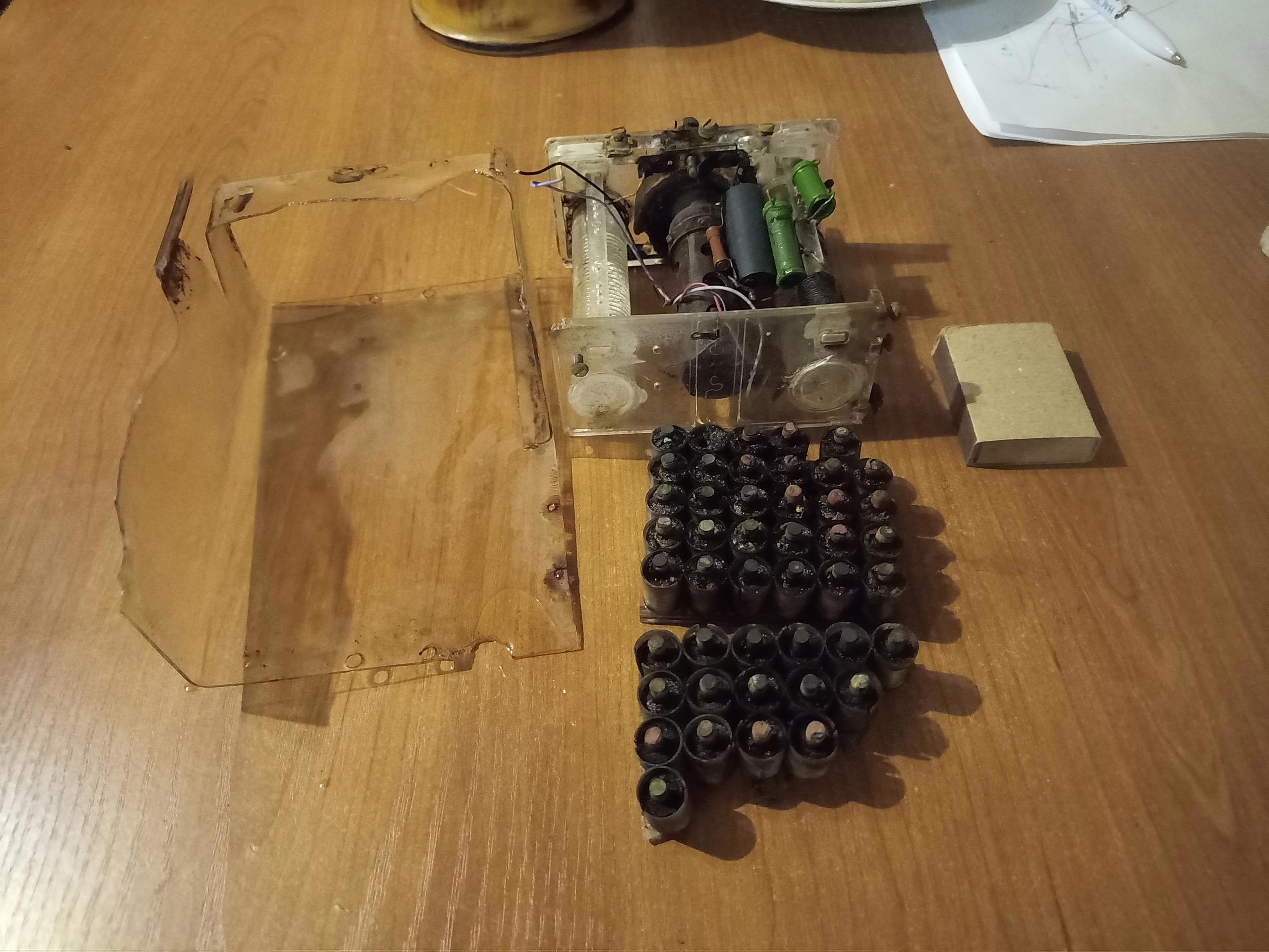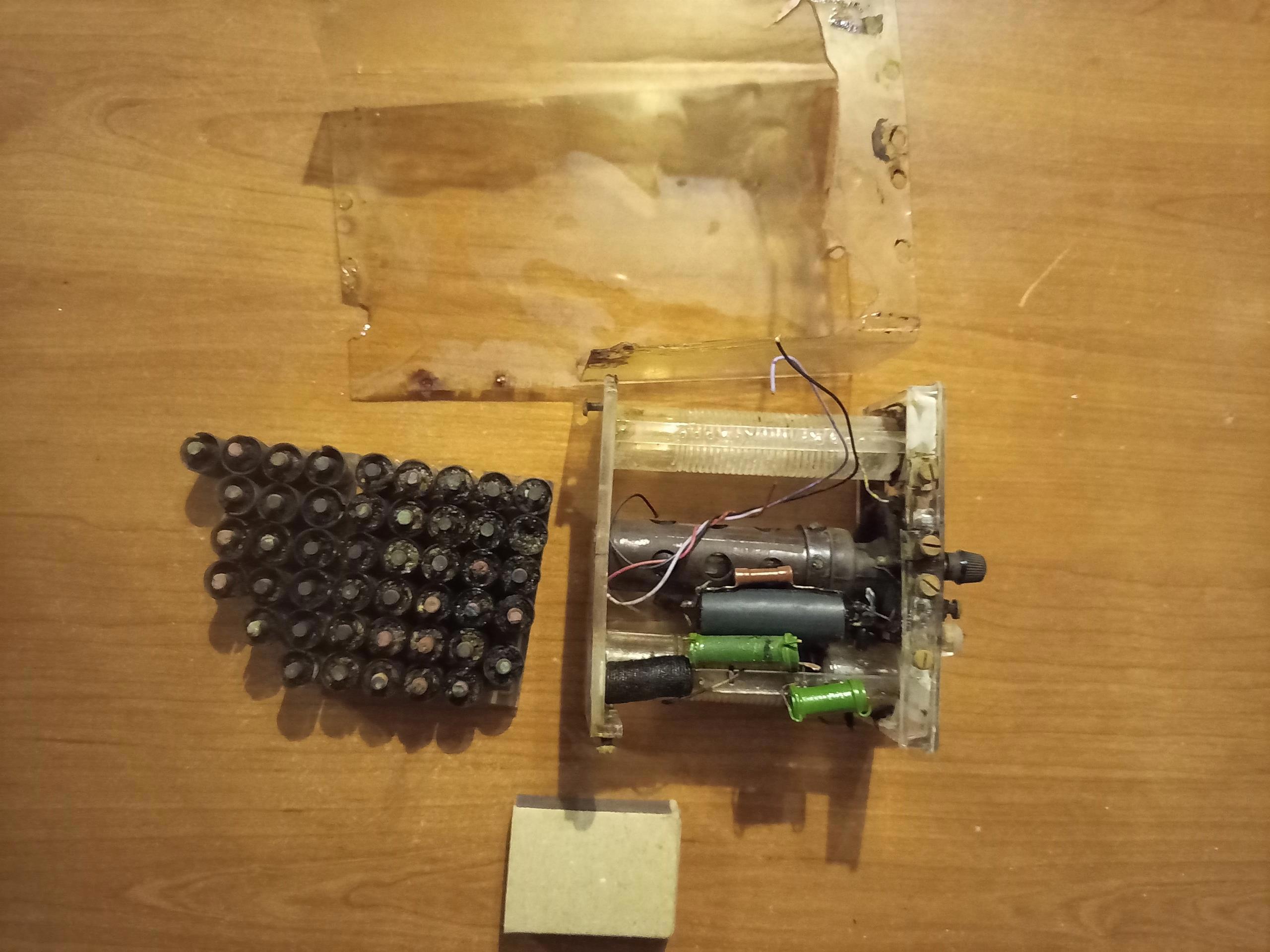 - Устройство блока на первых фото намекает на то, что это нечто радиотехническое. Помимо резисторов и конденсаторов, присутствуют два пластиковых основания со следами намотки провода, которые, возможно, служили катушками индуктивности. Также имеется одна радиолампа фирмы Tekade.
