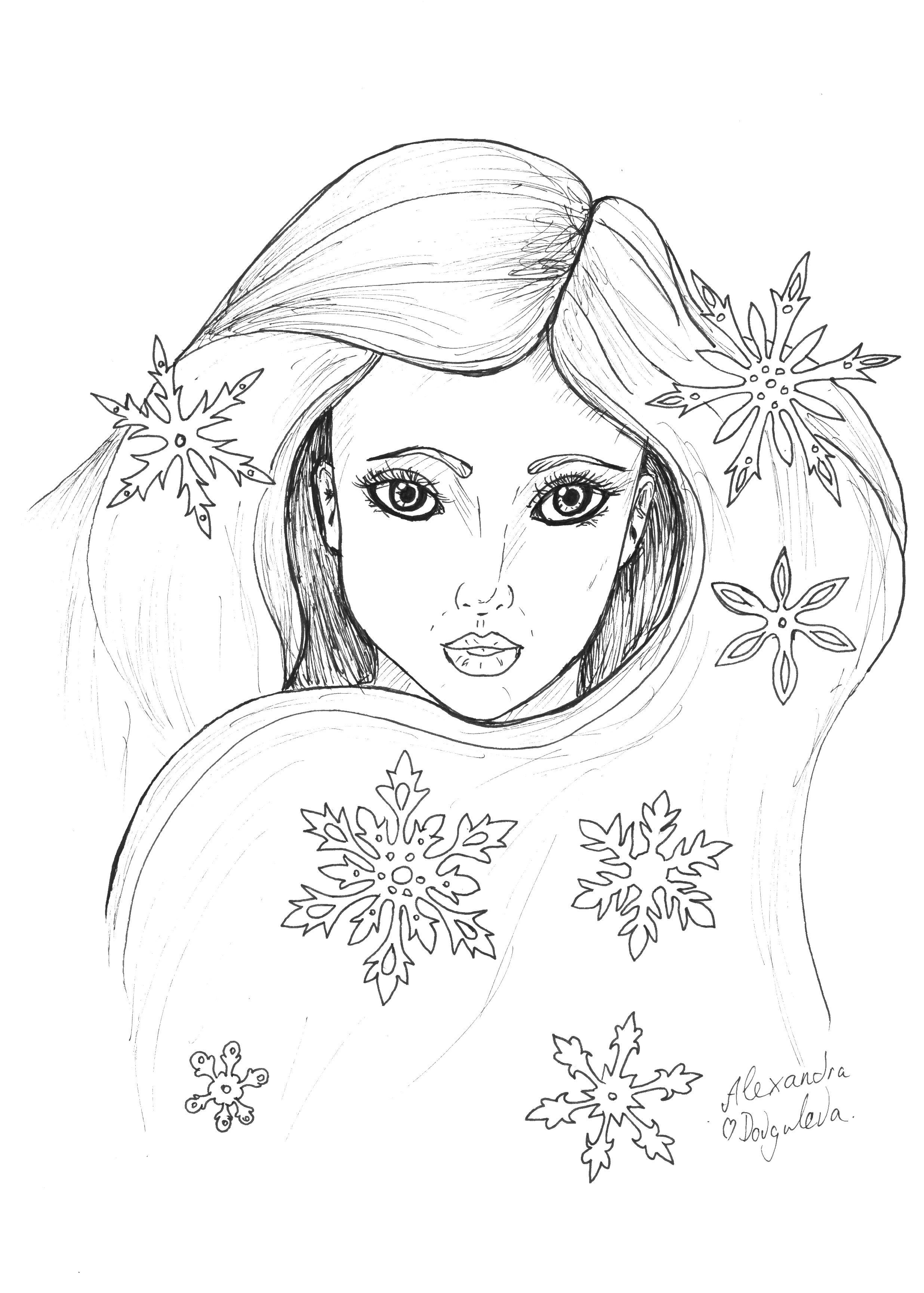Креплю один из своих рисунков. Не по теме: просто хочется. Хотя... Это одна из героинь моей книги "Глазами сокола". Там королева Мирида превратилась в метель... Может, это она ненадолго заглянула в мои окна? Проверить, прилежно ли я пишу историю её внуков... Кто знает?