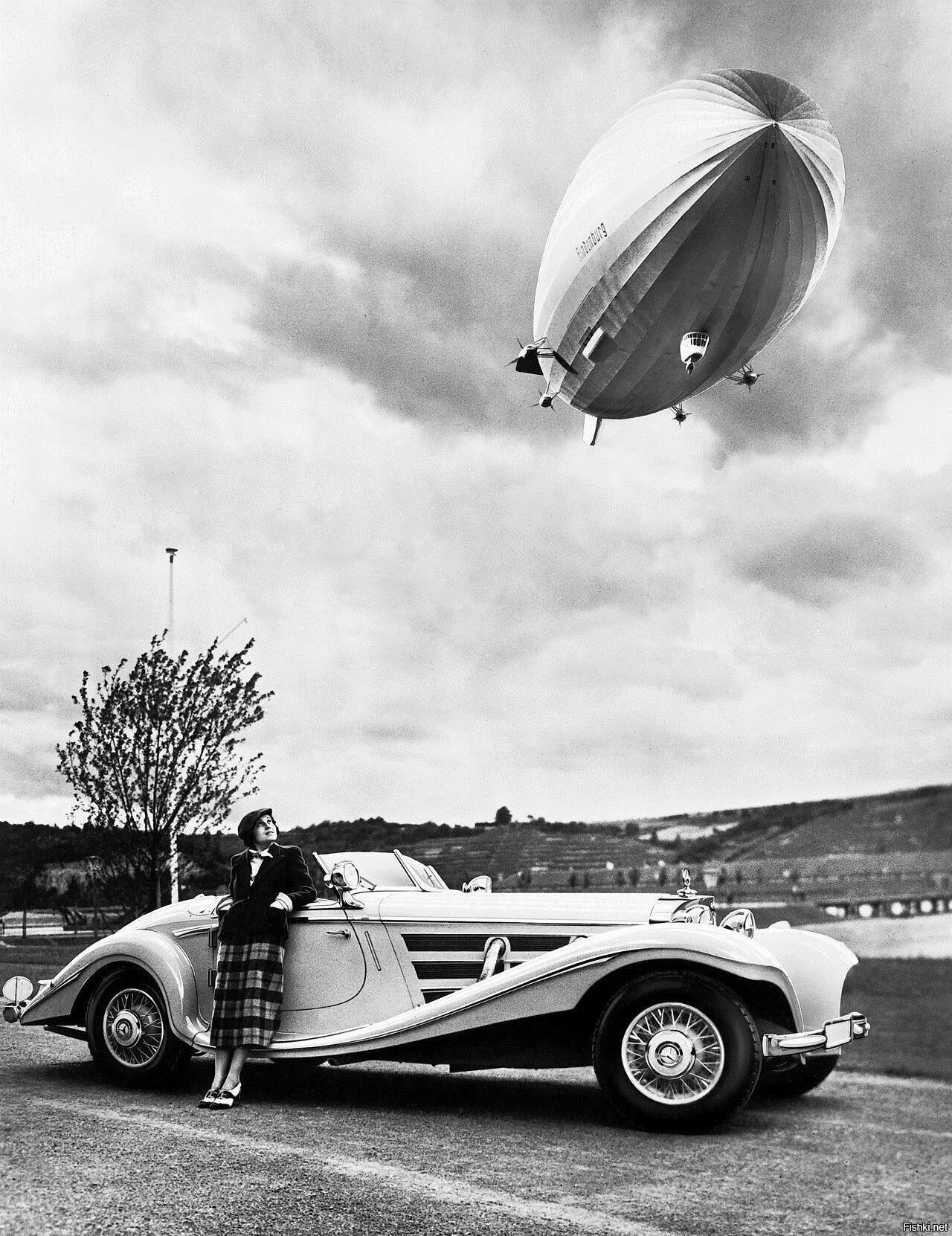 Родстер Mercedes Benz 540K 1936 года выпуска. Дирижабль над автомобилем - знаменитый "Гинденбург"