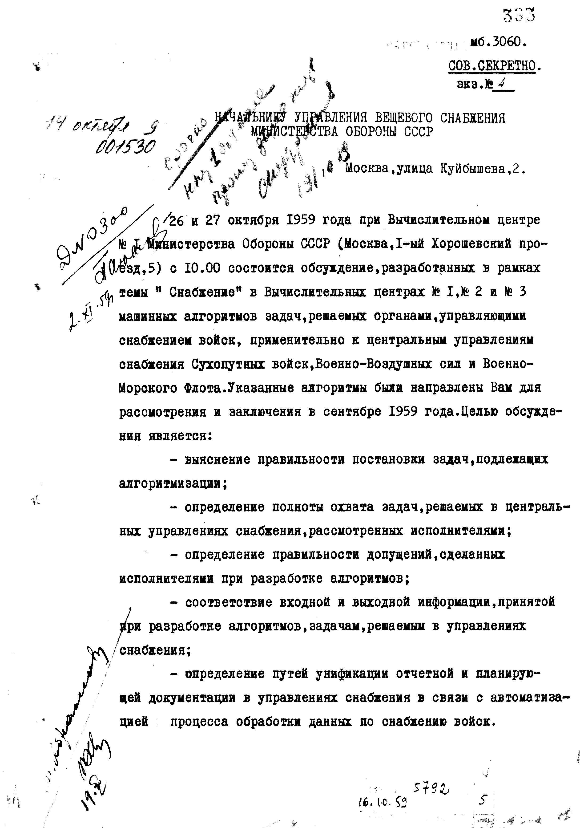 Итак, в соответствии с Постановлению Совета Министров СССР, в июне 1954 года был создан Вычислительный центр № 1 МО СССР – первый советский вычислительный центр, предназначенный для решения особо важных задач Министерства обороны СССР на основе использования вычислительной техники (более подробно о истории создания и работы ВЦ № 1 МО СССР можно ознакомиться по ссылке: https://www.partner-inform.de/memoirs/detail/bessmertie-pod-grifom-sov-sekretno/2/887?lang=ru).