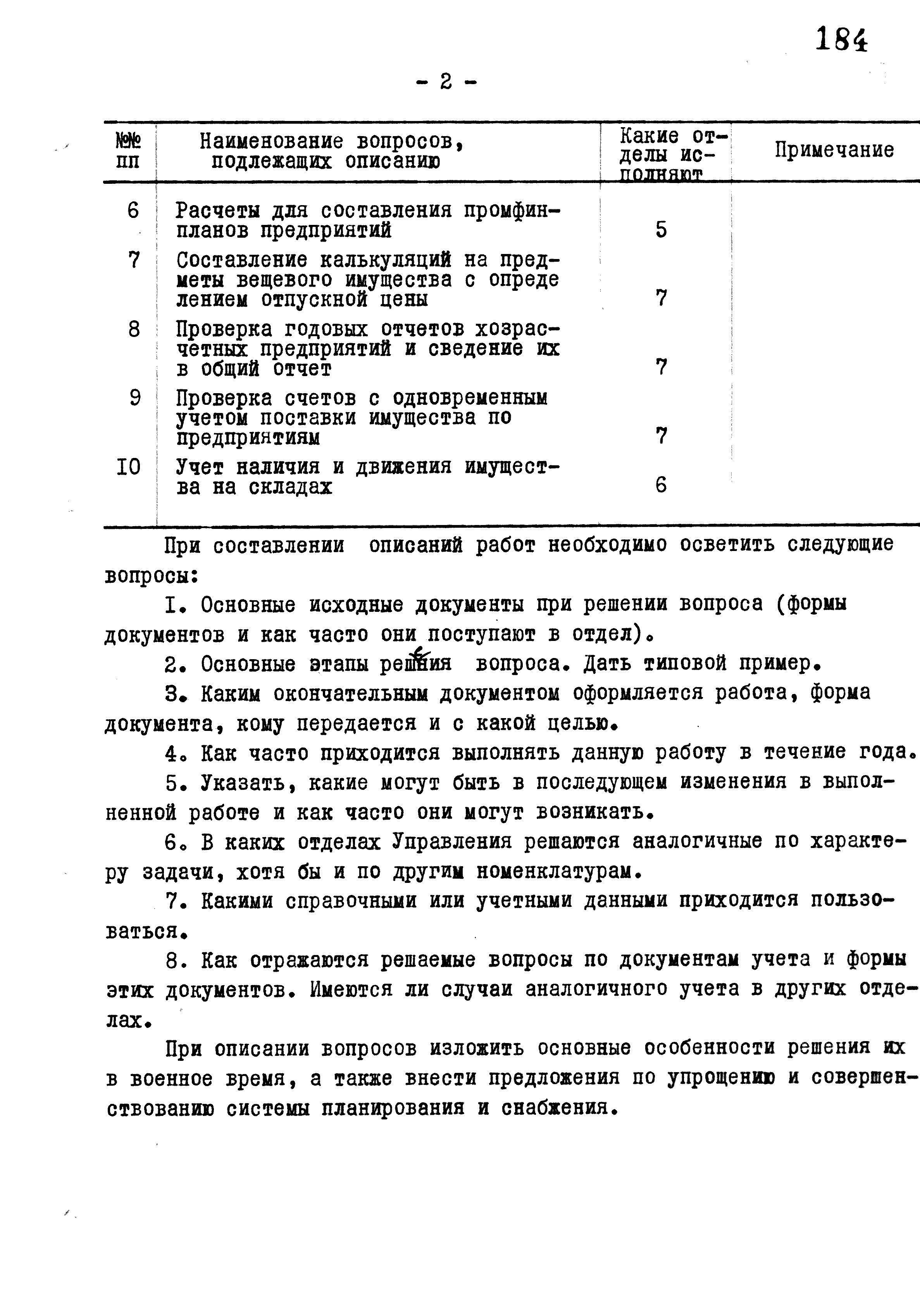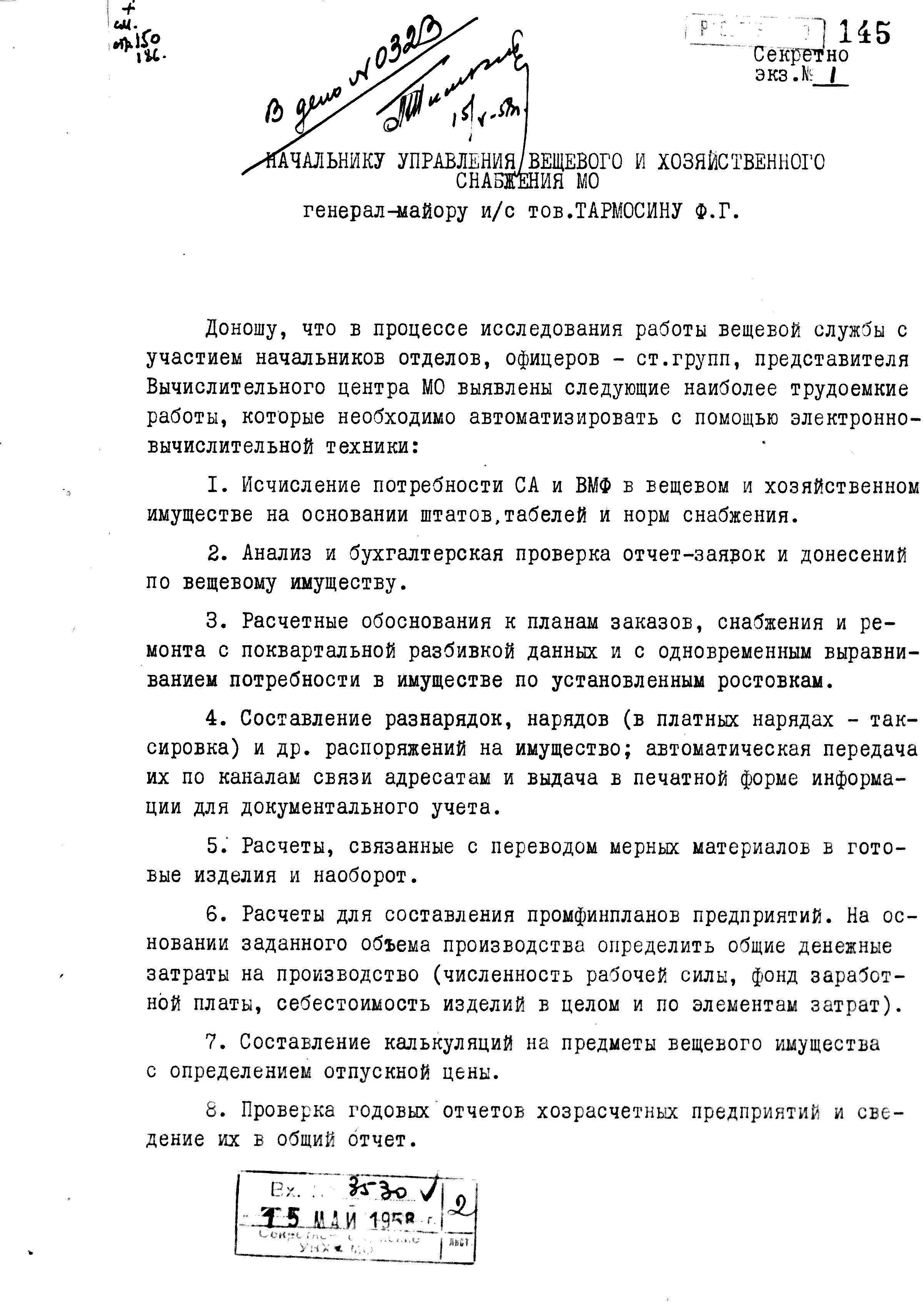 д/с Доклад начальнику Управления вещевого и хозяйственного снабжения МО СССР с перечнем трудоёмких работ, которые необходимо было автоматизировать с помощью ЭВМ