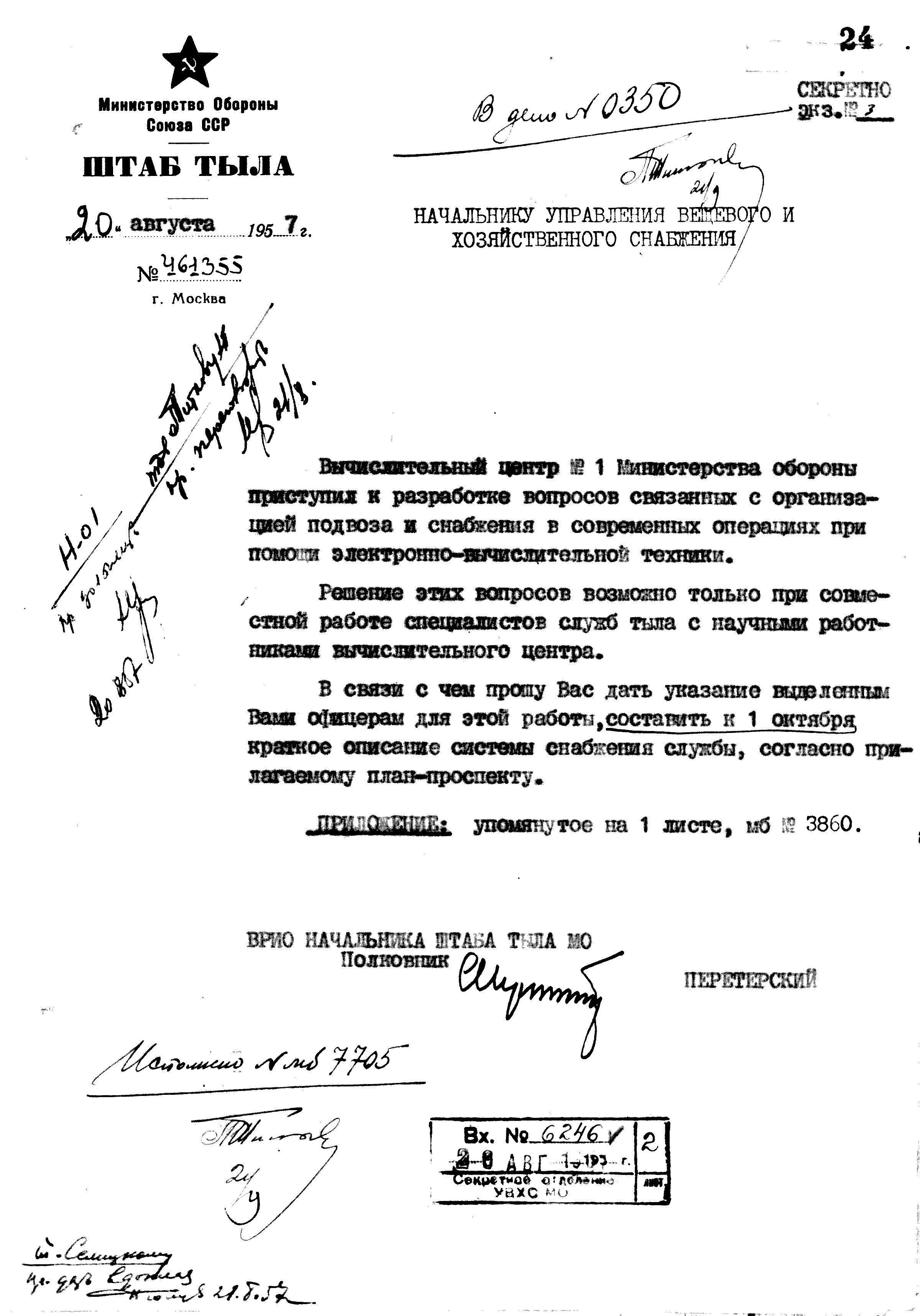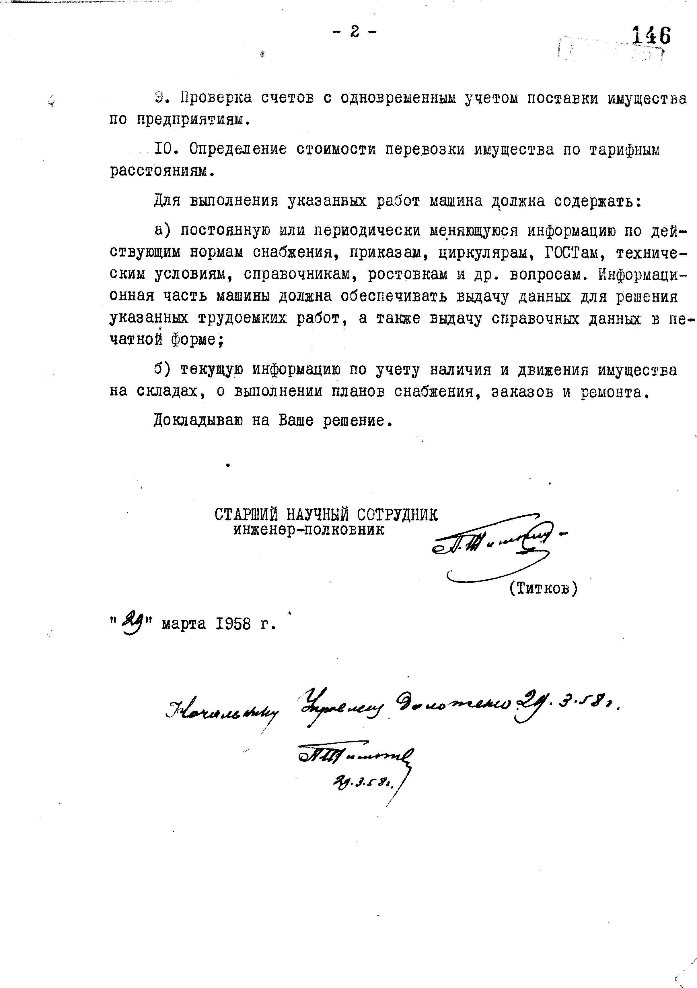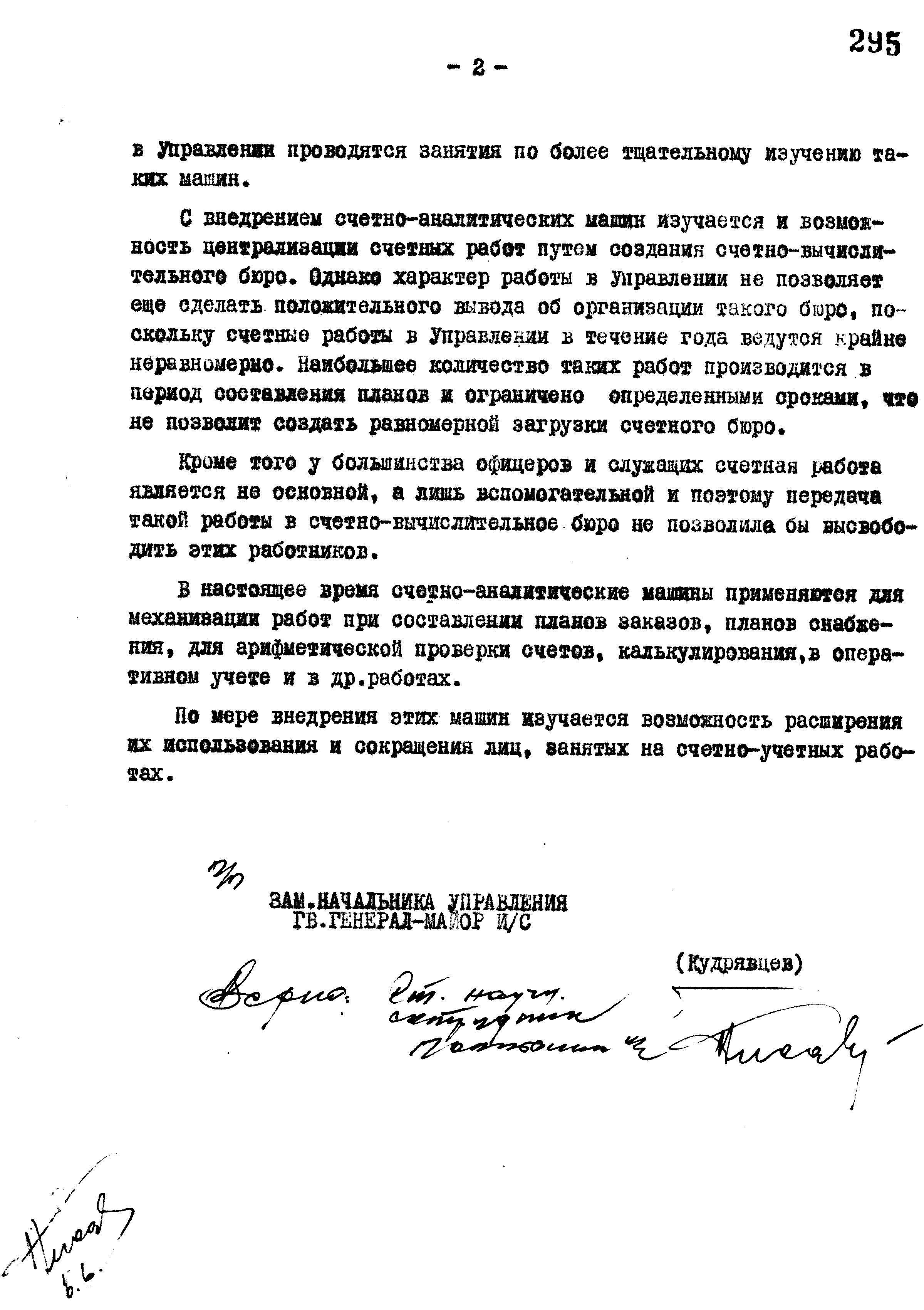 Но почему специалисты снабжения так быстро и активно начали участвовать в реализации задачи по применению ЭВМ в их повседневной деятельности. Судя по докладу начальника Управления вещевого снабжения, применение в органах управления счётных машин для проведения расчётов к тому времени было вполне обыденным явлением. Несмотря на то, что сами машины стали применятся только в 1957 г., к 1959 г. все уже не только поняли их пользу, но в Управлении даже сократили несколько должностей специалистов, занимавшихся расчётами.