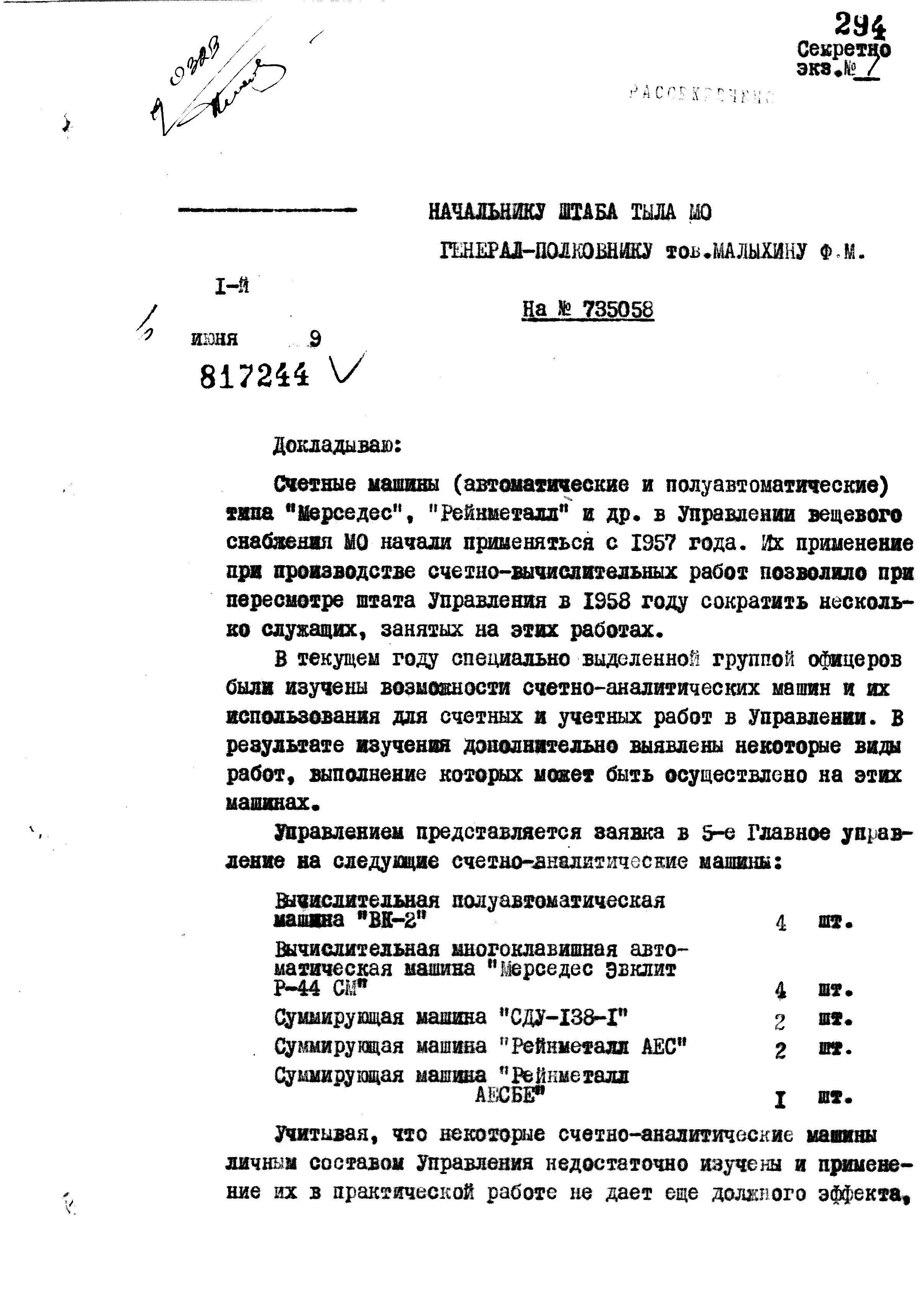 И я очень сильно сомневаюсь, что речь в записке шла о трофейной технике. Даже несмотря на её немецкие названия. Всё же наличие автоматических и полуавтоматических вычислительных средств скорее всего свидетельствует о том, что это уже послевоенный выпуск. Хотя, могу и ошибаться, специалистам по истории ЭВМ было бы гораздо яснее и понятнее.
