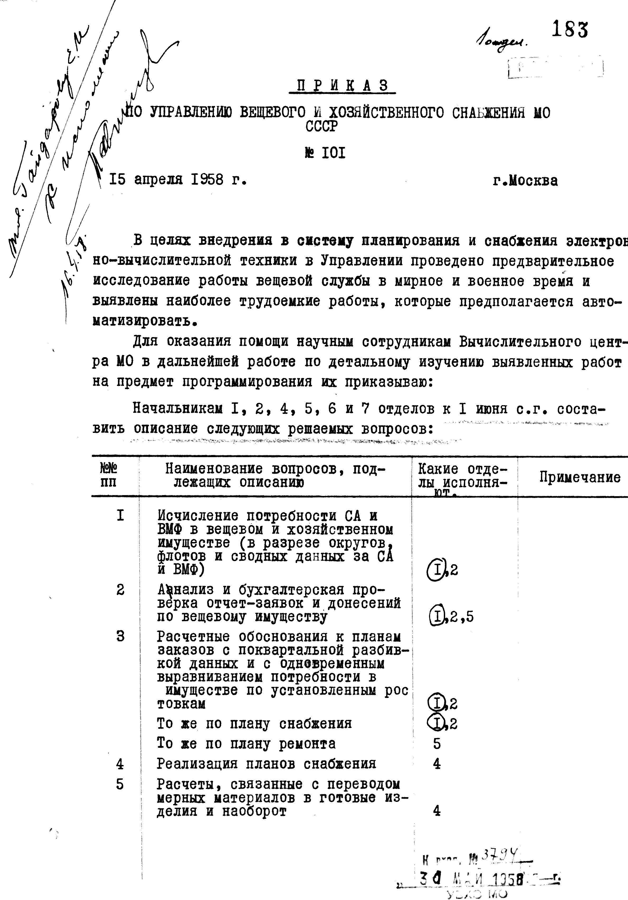 Прекрасно понимая, что для написания любой программы для ЭВМ необходима консультация специалиста, который сможет разъяснить все особенности организации учета и планирования, начальником УВХС МО СССР был отдан приказ по Управлению, о привлечении сотрудников Управления к работу и подготовлен перечень вопросов, которые необходимо было решить при написании программ для ЭВМ:
