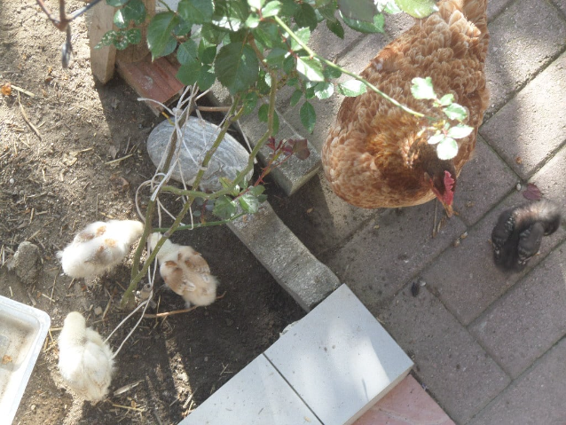 А тут мама квохкает и глядишь, уже и зернышко в рот попало и травка свежая откуда-то из земли проклюнувшаяся, по маминому призыву найдена и съедена. И вообще, хорошо за маминой спиной. Вон она червячка нашла и зовет детишек, идите, мол, шашлык кушать будем.