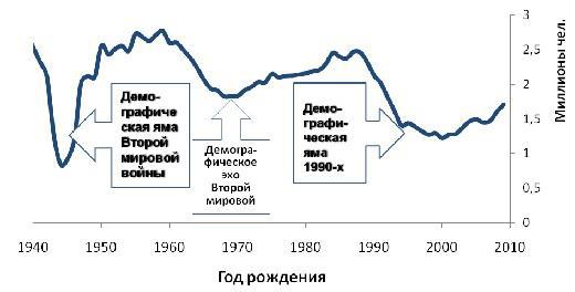 Во-первых, наша с вами молодежная страта немногочисленна: это плоды демографической ямы 90-х, которая, в свою очередь, стала наследницей предыдущего демографического провала Второй мировой войны. Если посмотреть на нашу с вами демографическую пирамиду, видны эти повторяющиеся вмятины – нерожденные дети мертвецов. Эта яма немножко сглаживается с течением лет и будет сглаживаться дальше, если дальнейшее наше историческое развитие пойдет без катастроф, но она есть.