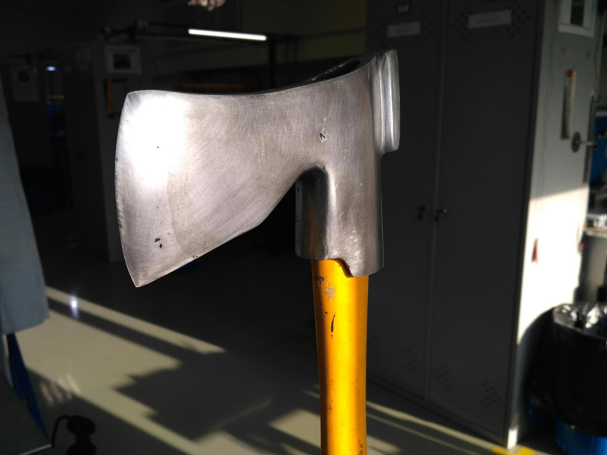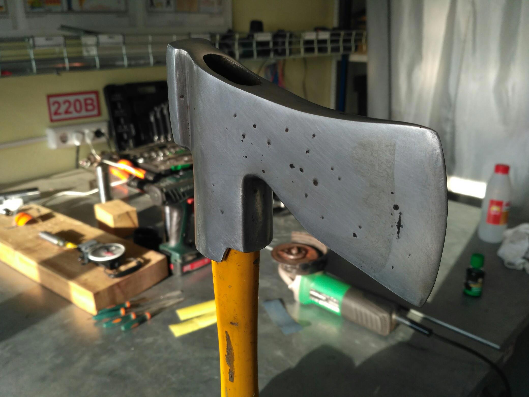 Финальную шлифовку делал вручную. Остановился на зерне 320 - вполне достаточно для ровной матовой поверхности. Посадочное гнездо под топорище обработал ортофосфорным антикором. Кстати, тут можно заметить следы зонной закалки - цвет металла возле лезвия ощутимо отличается и имеет чёткую границу.
