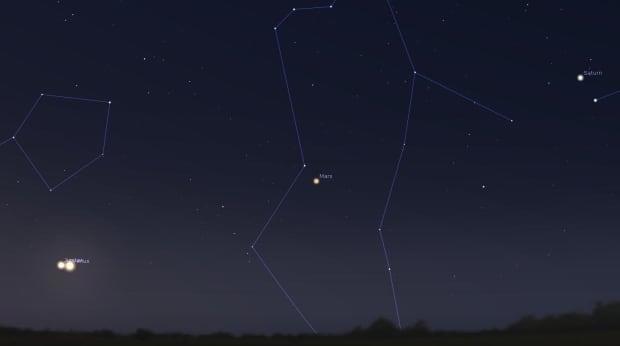 Внизу слева, Венера, Юпитер, далее слегка красновпты Марс в центре. Сатурн, справа вверху.