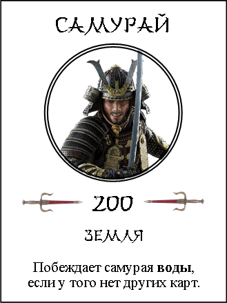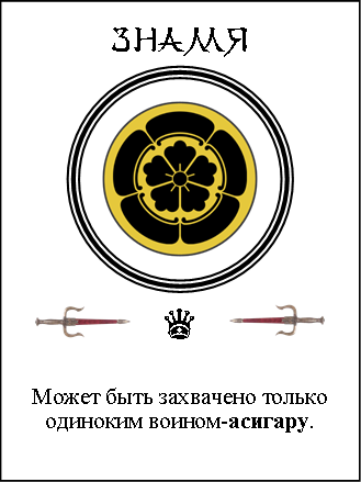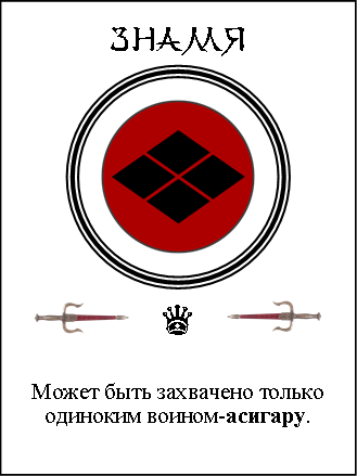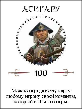 Асигару — слабый воин, всего 100 очков. Но у этой карты есть целых две способности. Во-первых — как я уже сказал, только асигару может взять вражеское знамя. Во-вторых, тайсё с картой «Асигару» на руках может в любой момент добежать до «Мертвятника» и передать эту карту любому погибшему из своей команды. Погибший «оживает» и может бежать захватывать знамя. Это может быть полезно и в том случае, если у тайсё 150 очков, а за ним гонится дракон (и он это знает)