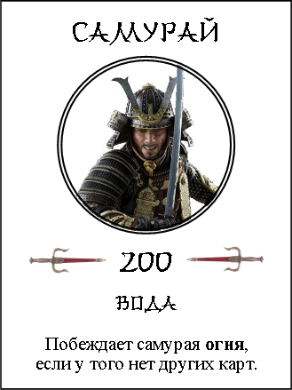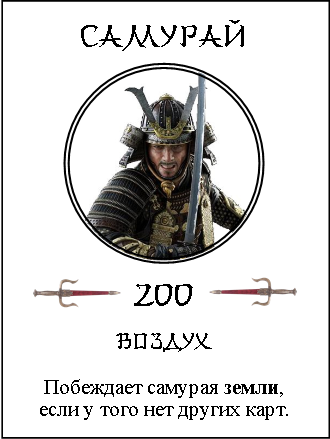 Самураев (200 очков) с начала игры может быть только установленное число — четыре игрока, по двое на команду. Каждый самурай представляет одну стихию и одна команда получает «огонь» и «землю», а вторая — «воду» и «воздух». При встрече друг с другом между одинокими самураями из противоположных команд ничья невозможна. «Огонь» побеждает «воздух», «воздух» бьёт «землю», «земля» бьёт «воду», «вода» побеждает «огонь». Получившийся тайсё разом становится сильнее дракона.