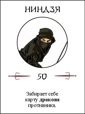 Начну с самого сильного — дракон. Обладатель трёхсот изначальных очков, который может без труда сожрать любого самурая, асигару и тайсё послабее. У воина-дракона нет особых способностей. Он просто очень толстый. И при этом уязвимый. Если игрок, у которого на руках есть карточка дракона, сходится в поединке с одиноким ниндзя, он отдаёт ему эту карточку. Ниндзя превращается в тайсё (с силой в 350), и бывший обладатель дракона (если у него было на руках что-то ещё) должен бежать от него подальше.