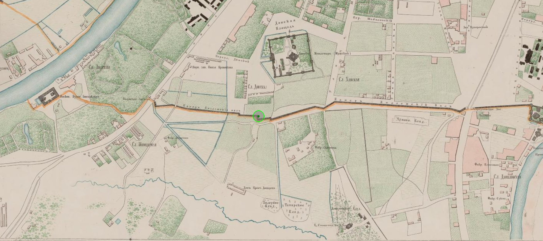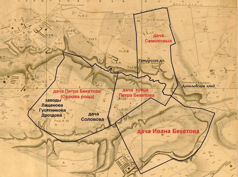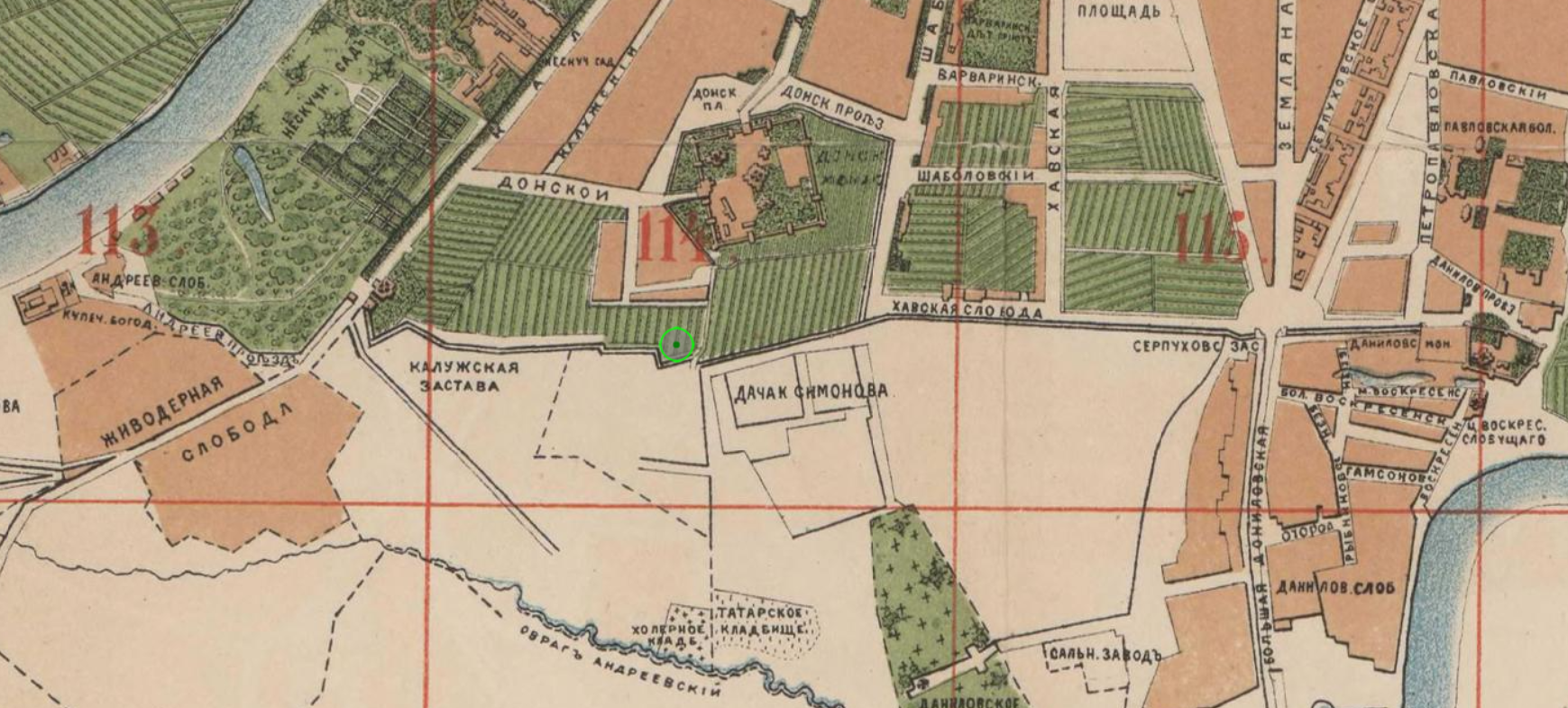 На фрагменте карты 1881 года южнее Донского монастыря указана дача К. Симонова. "К." может расшифровываться, как купец.