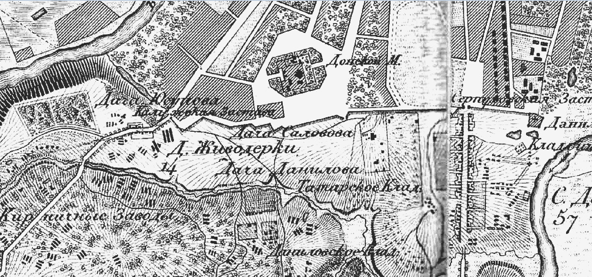 На фрагменте карты, созданной в 1823 году в Военно-Типографическом Депо при Главном штабе Его Императорского Величества по данным, снятым офицерами квартирмейстерской части в 1818 году, южнее Донского монастыря располагается некая "Дача Саловова". Подпись эта слишком большая, и понять, к какому конкретно месту на карте она относится — невозможно. Зато есть наложение на план выгонных земель топографической съемки 1851 года, на котором видно, что дача Соловова располагалась южнее.