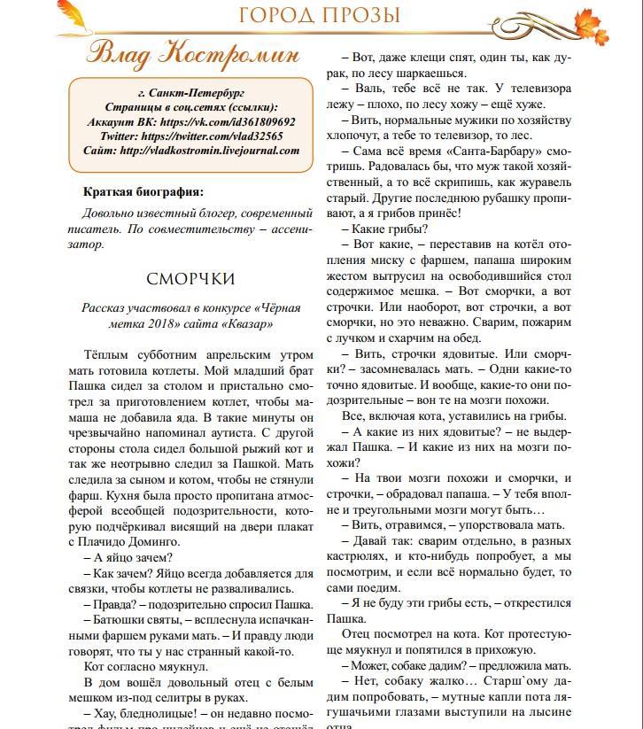 И снова публикация Костромина. На сей раз рассказ "Сморчки" опубликован в журнале "Страна озарение" в № 66